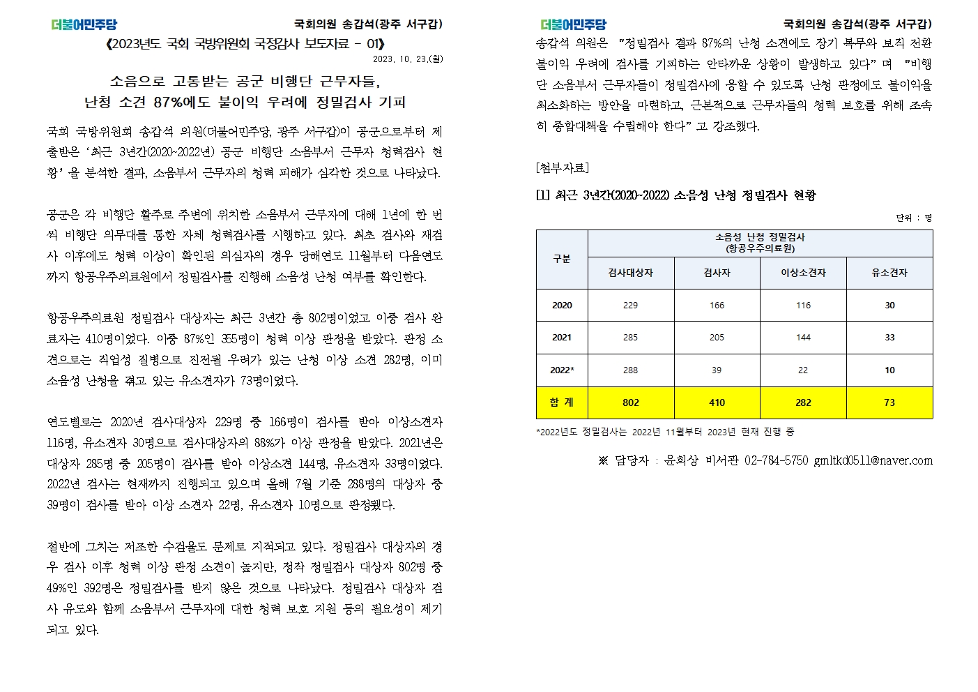 [국회의원 송갑석 국정감사 보도자료] 소음으로 고통받는 공군 비행단 근무자들, 난청 소견 87%에도 불이익 우려에 정밀검사 기피