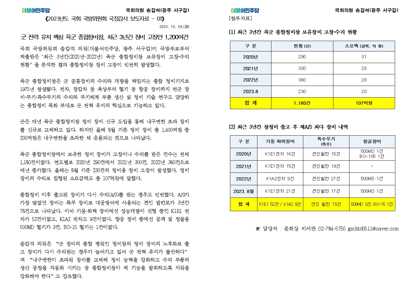 [국회의원 송갑석 국정감사 보도자료] 군 전력 유지 핵심 육군 종합정비창, 최근 3년간 장비 고장만 1,200여건