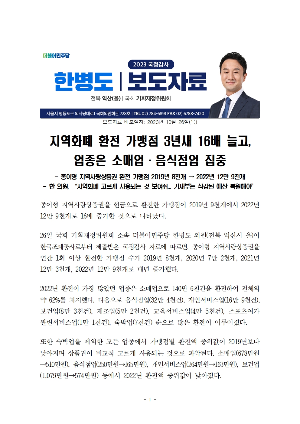 [국회의원 한병도 국감 보도자료] 지역화폐 환전 가맹점 3년새 16배 늘고, 업종은 소매업·음식점업 집중