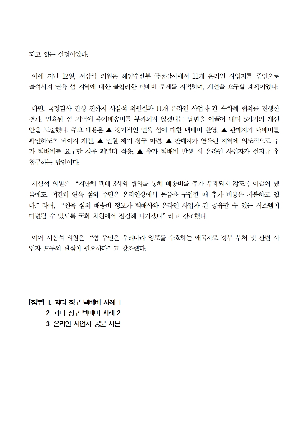 [서삼석 국회의원] 231025_온라인 상 물품 구매시 부과되는 연육 섬 추가 배송비