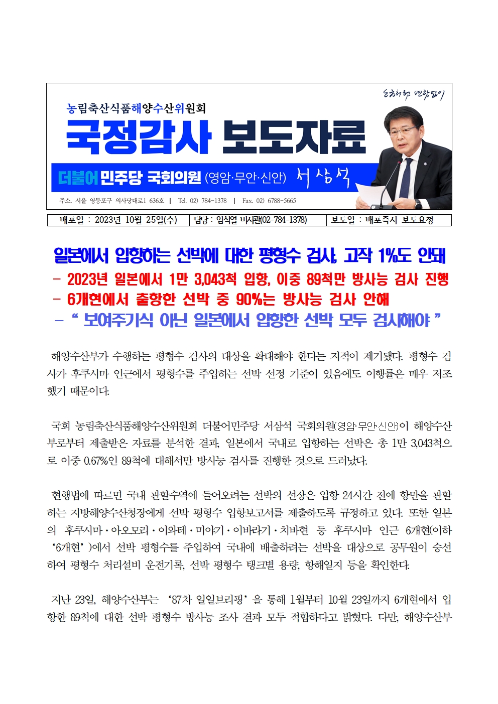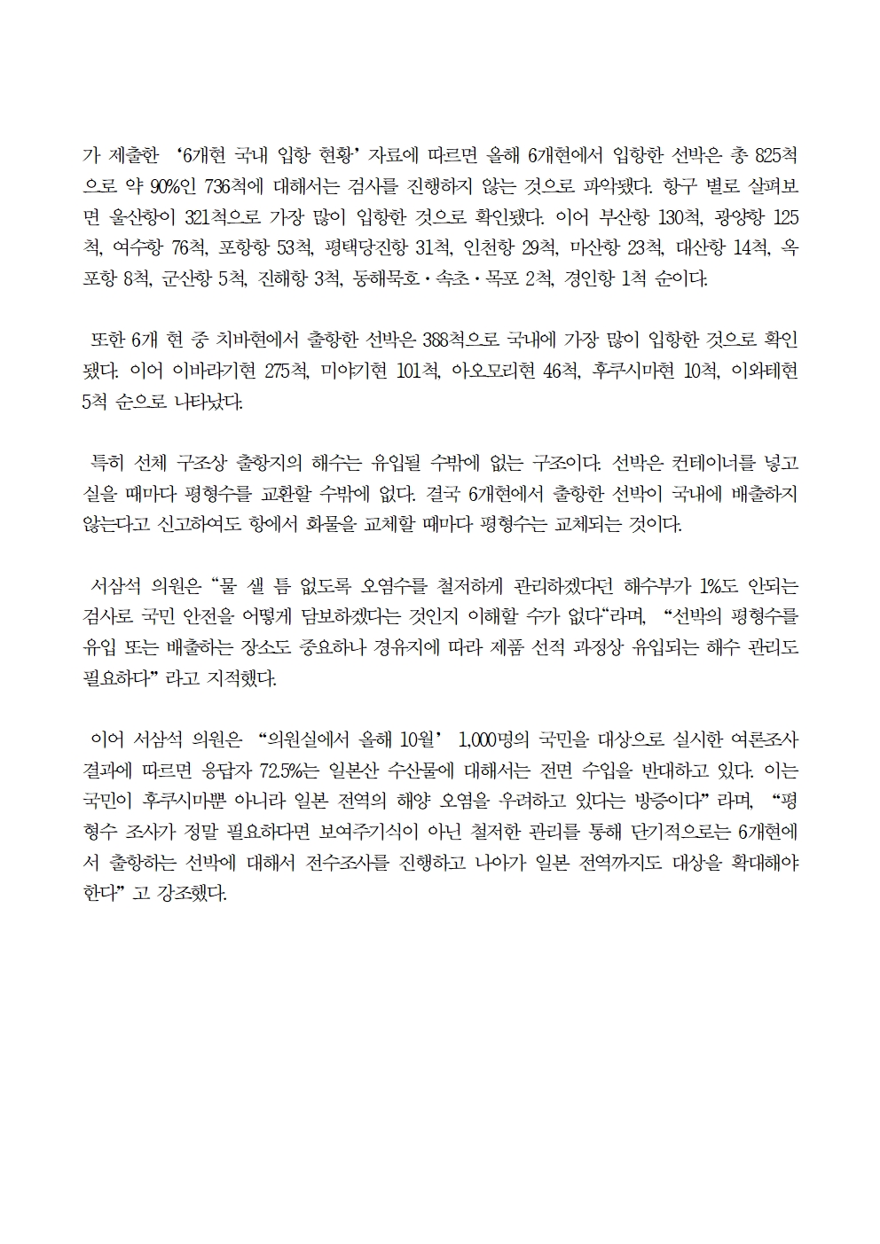 231025_[서삼석 국회의원] 일본에서 입항하는 선박에 대한 평형수 검사 고작 1%도 안돼(최종).hwp