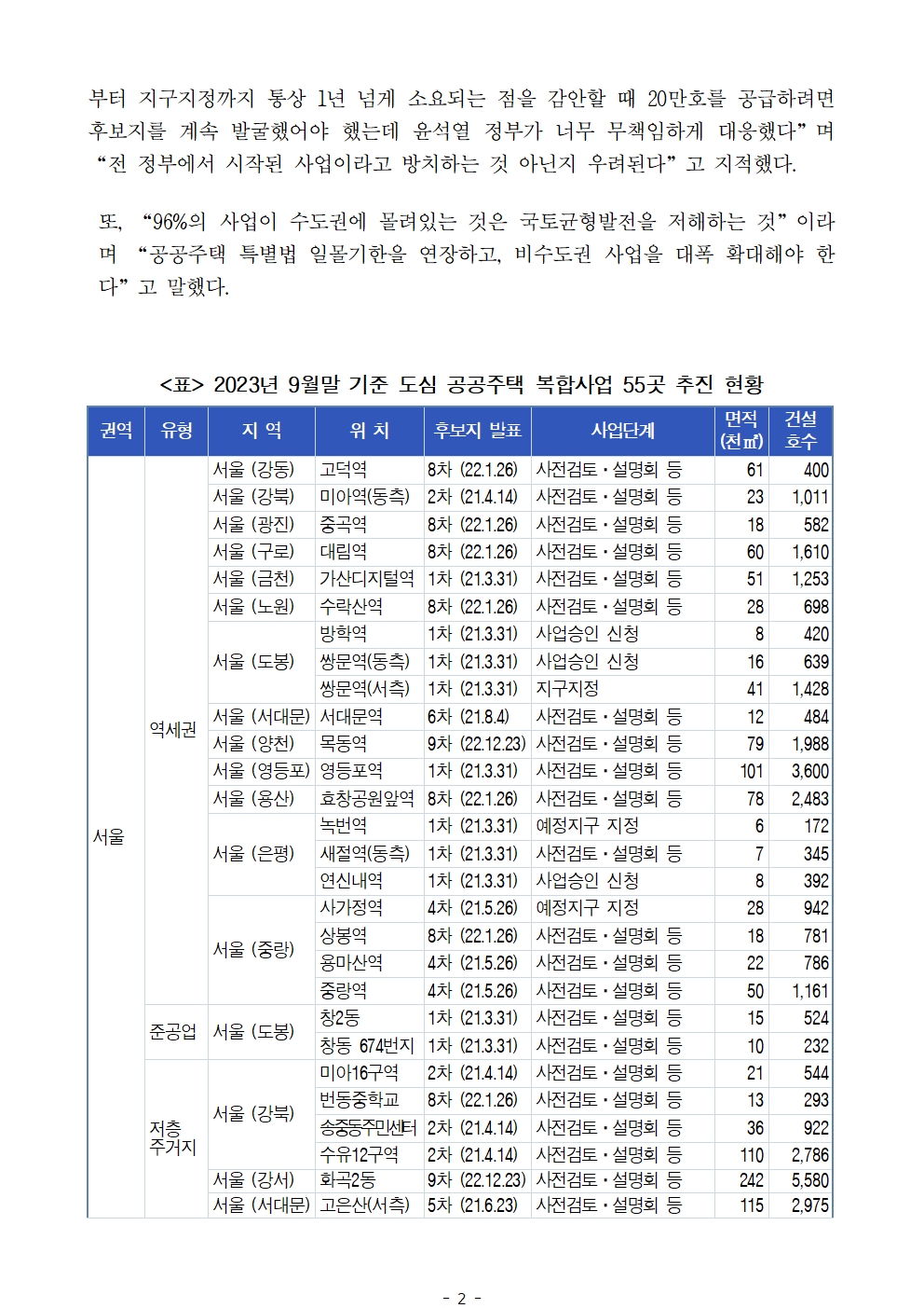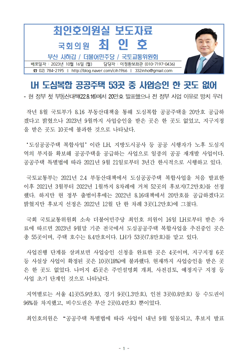 [최인호 의원 보도자료] LH 도심복합 공공주택 53곳 중 사업승인 한 곳도 없어