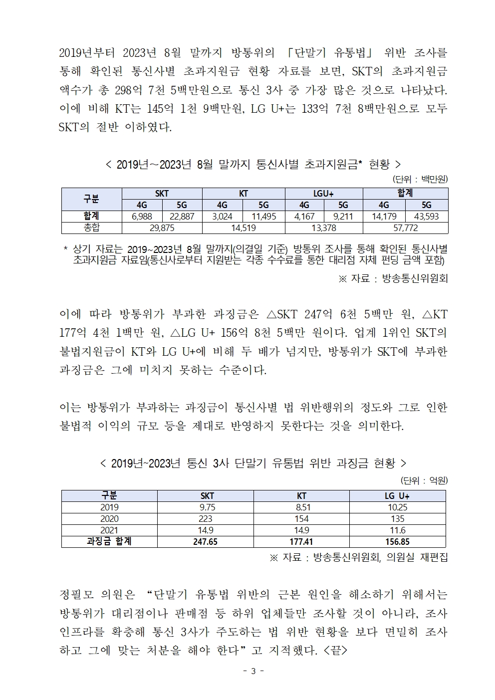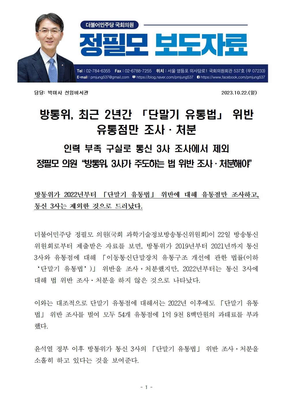 [정필모 의원 보도자료] 방통위, 최근 2년간 「단말기 유통법」 위반 유통점만 조사·처분