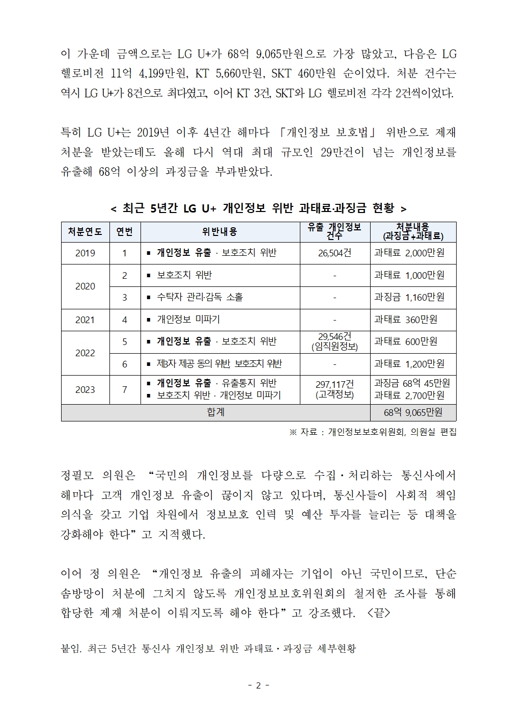 231023_보도자료_최근_5년간_全_통신사_유출_개인정보_48만여건_LG_U+_개인정보법_위반_최다.hwp