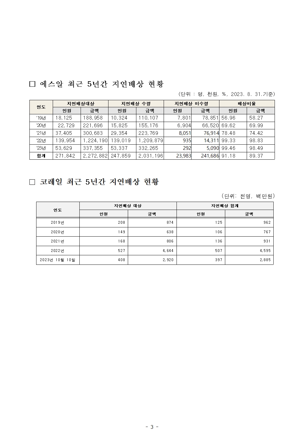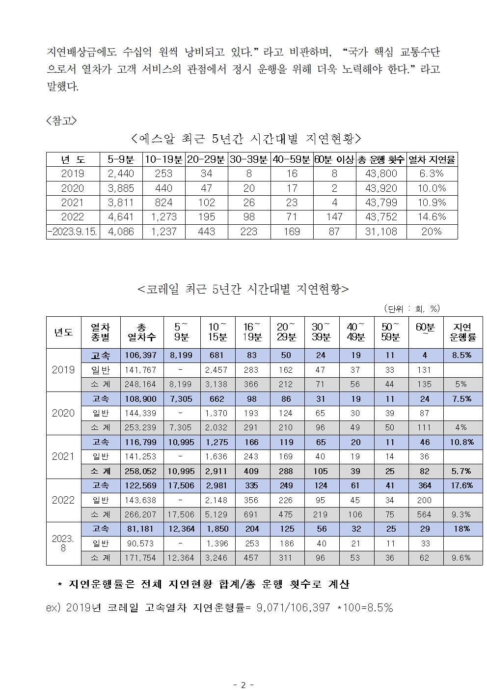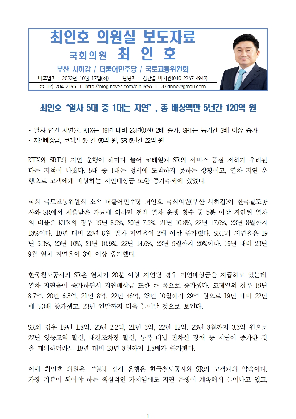 [최인호 의원 보도자료] 최인호“열차 5대 중 1대는 지연”, 총 배상액만 5년간 120억 원