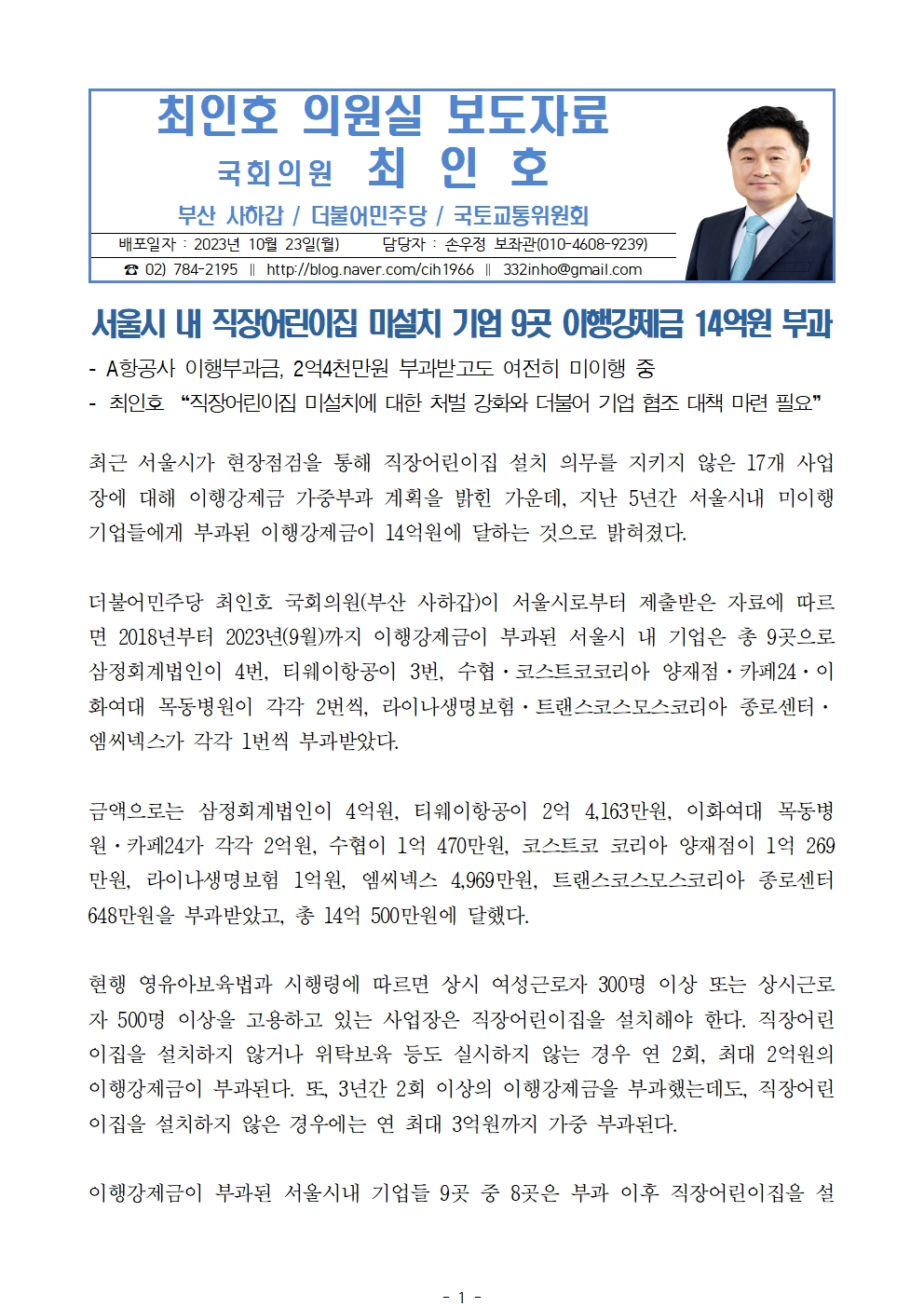 [최인호 의원 보도자료] 서울시 내 직장어린이집 미설치 기업 9곳 이행강제금 14억원 부과
