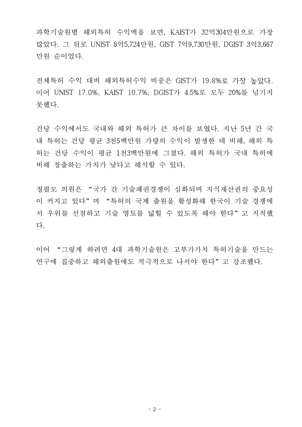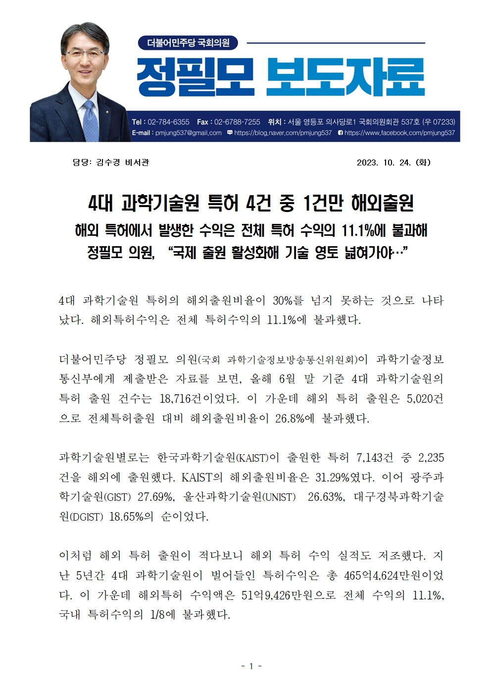 [정필모 의원 보도자료] 4대 과학기술원 특허 4건 중 1건만 해외출원