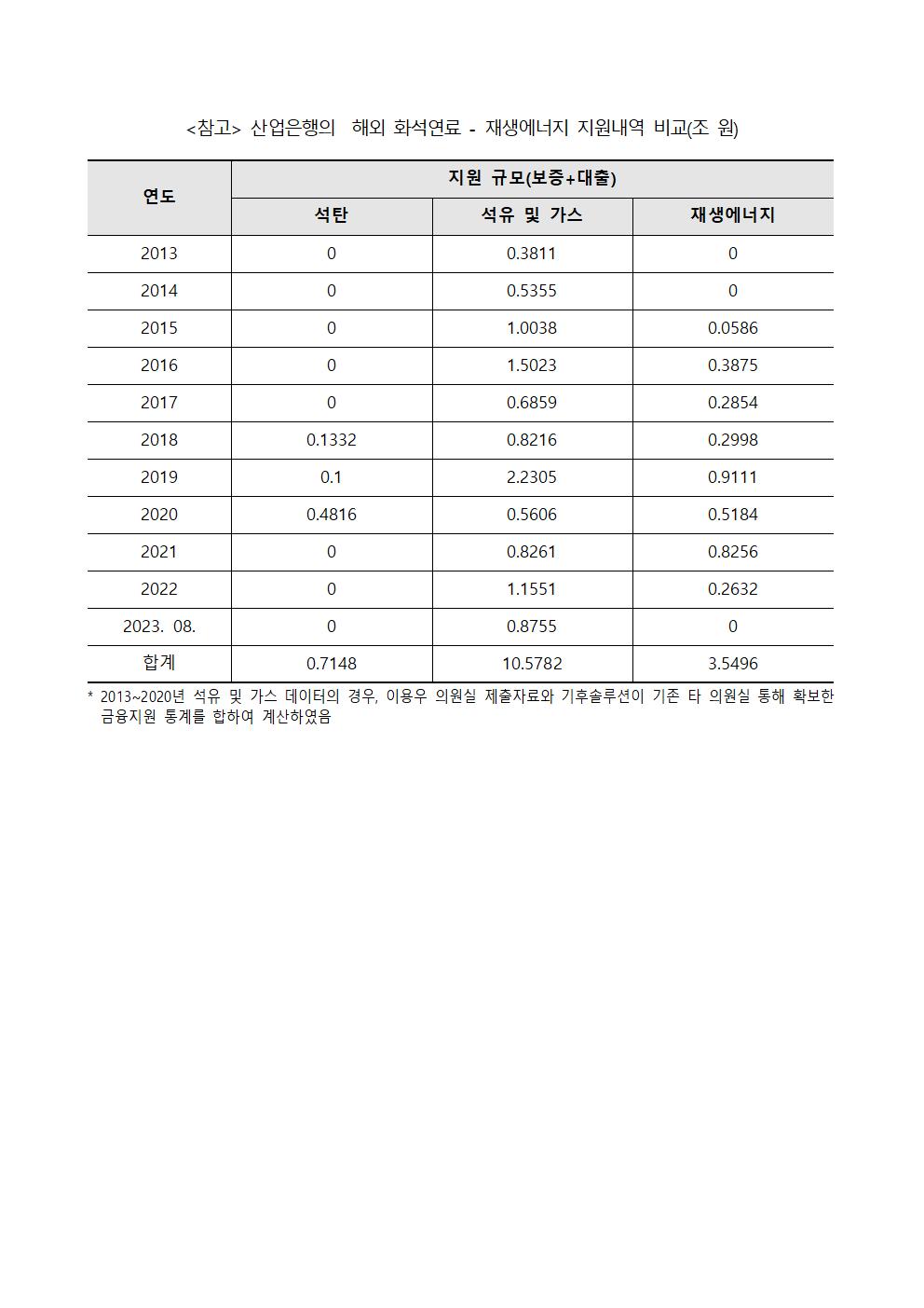 [이용우 의원] 산업은행 해외 재생에너지 금융지원 윤석열 정부 들어 급감 올해는 단 0원!