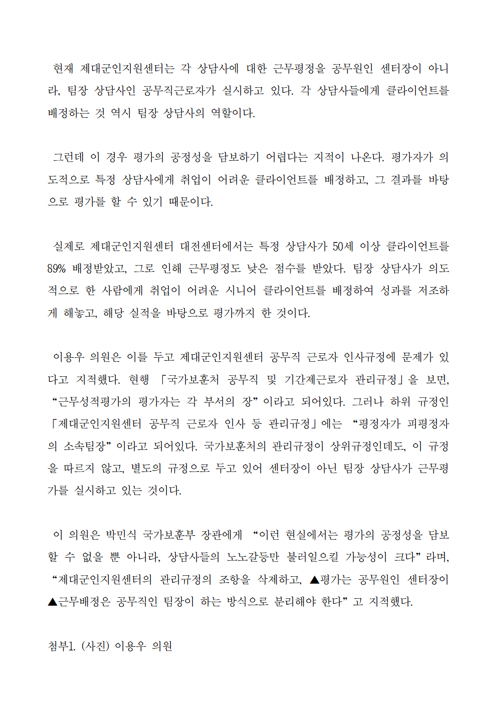 [보도자료] 이용우 의원_ 국가보훈부 제대군인 지원센터 상담사 평가기준 공정성 담보할 수 없어.hwp
