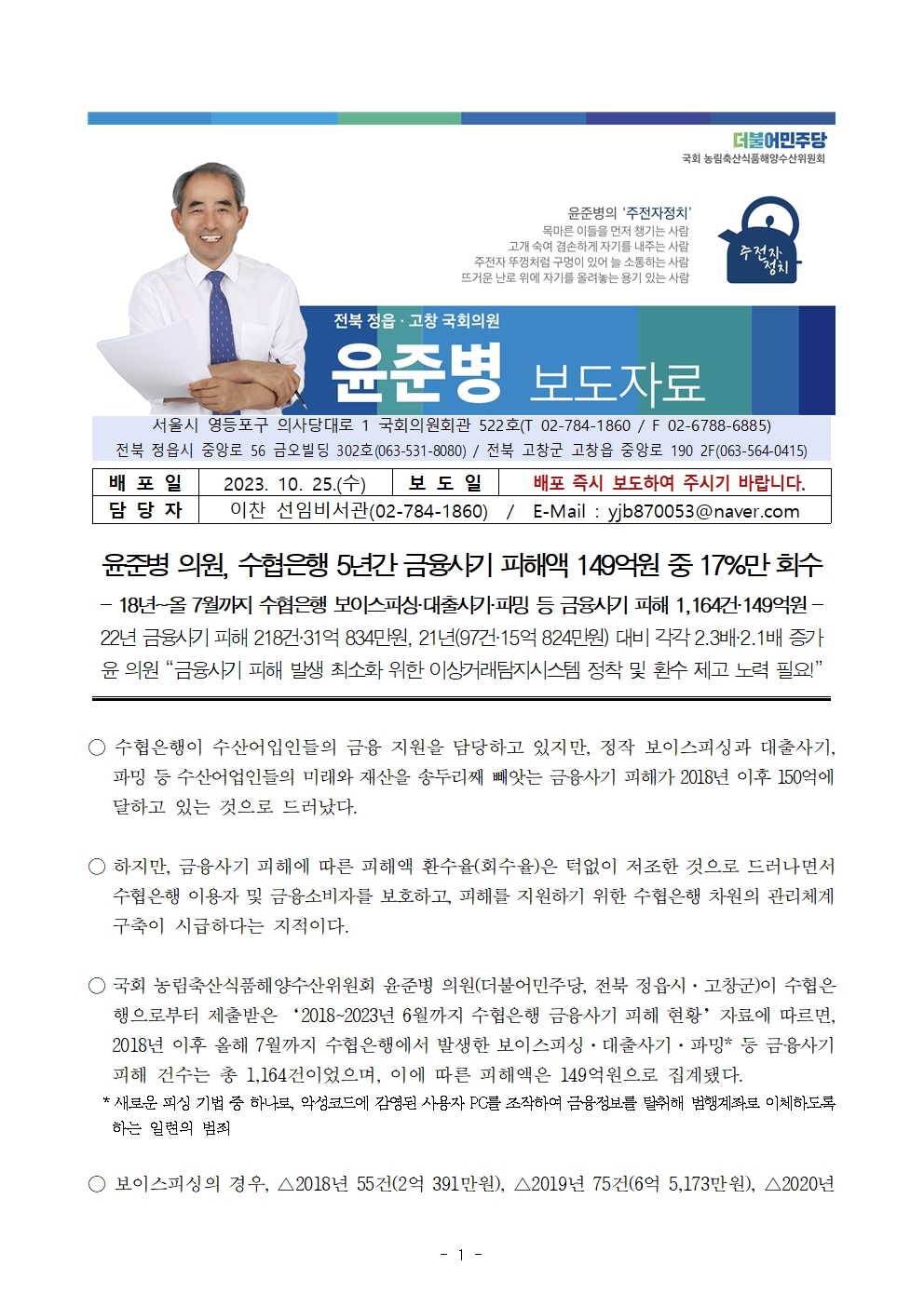 [윤준병 의원 국정감사 보도자료] 윤준병 의원, 수협은행 5년간 금융사기 피해액 149억원 중 17%만 회수