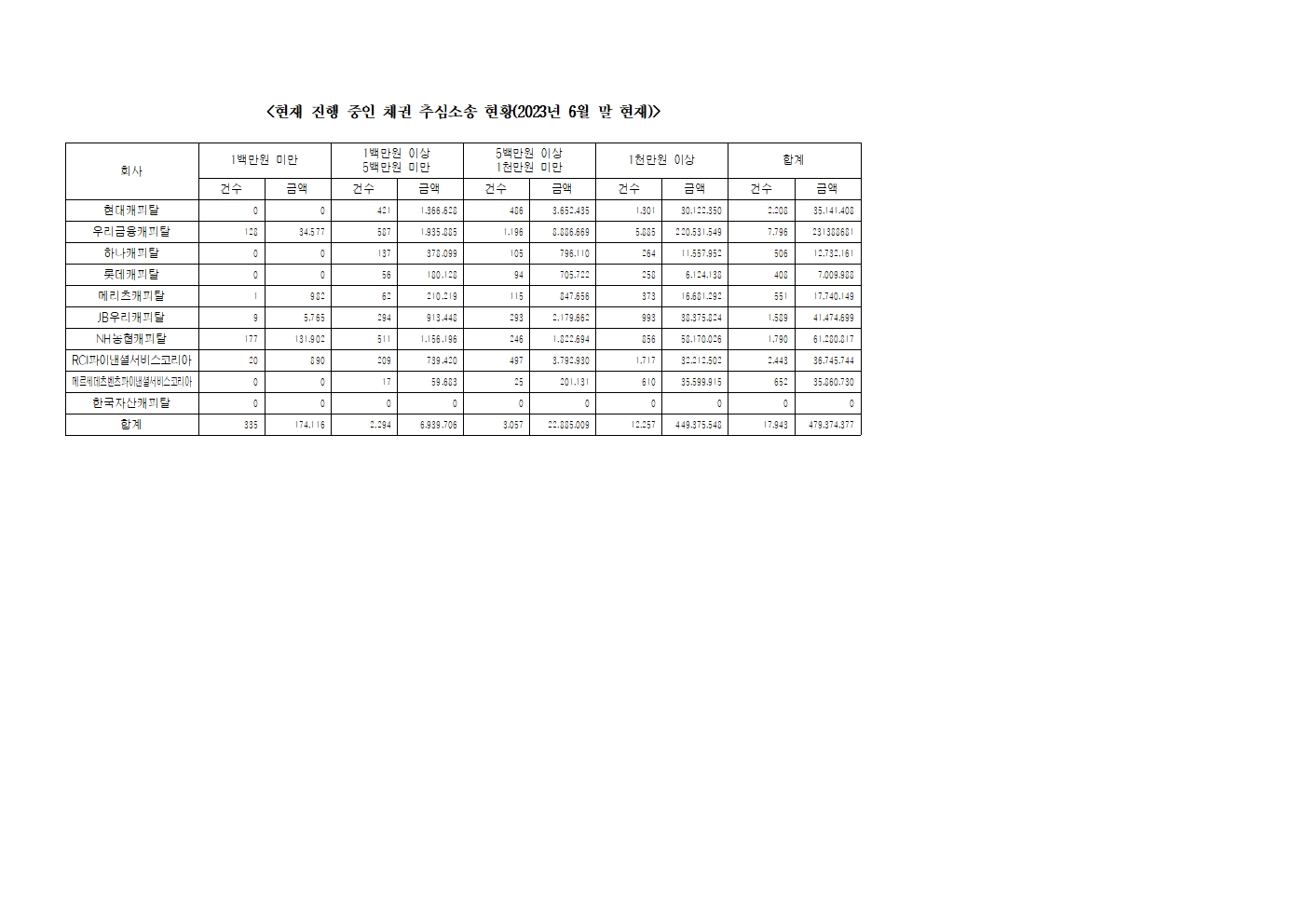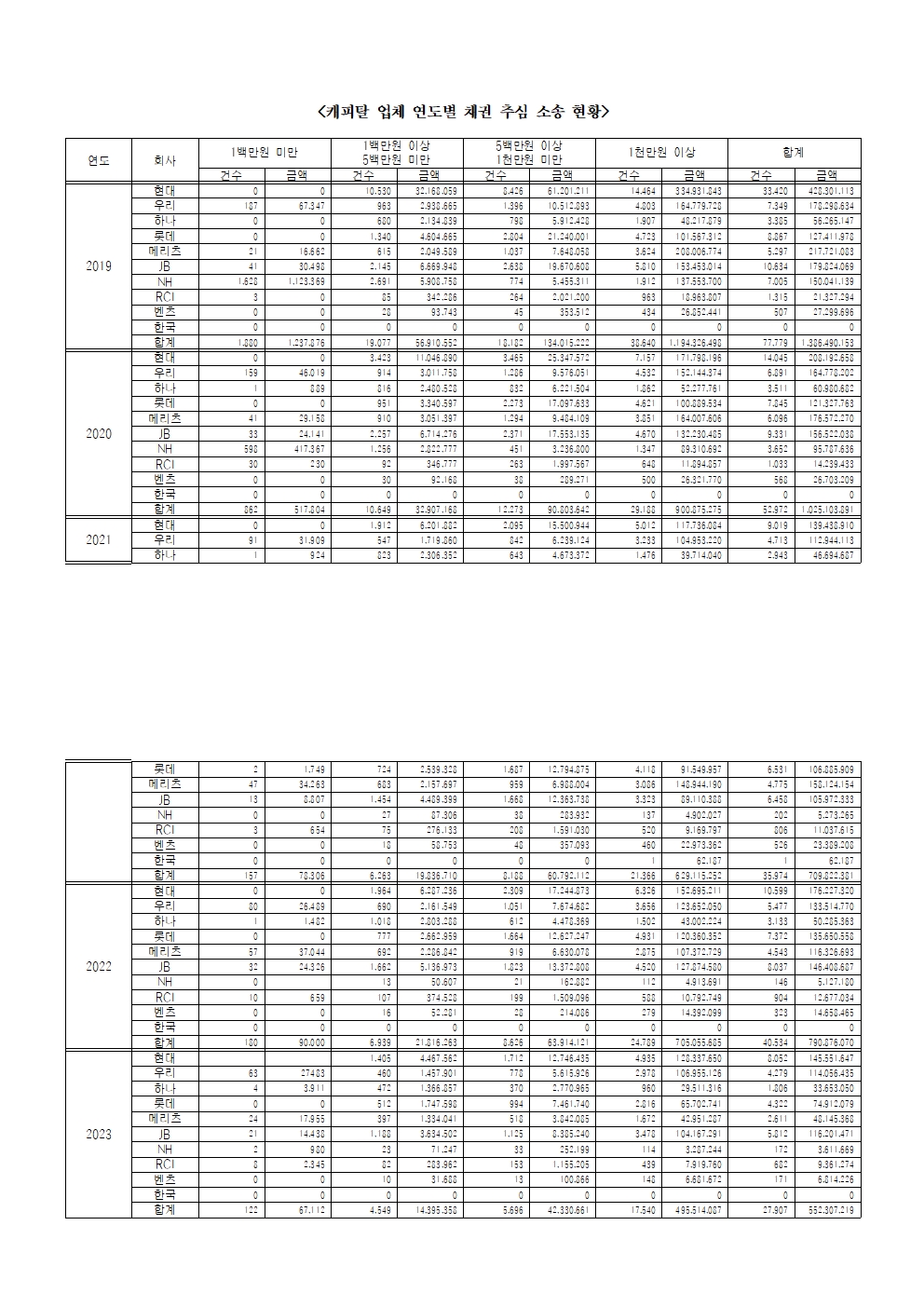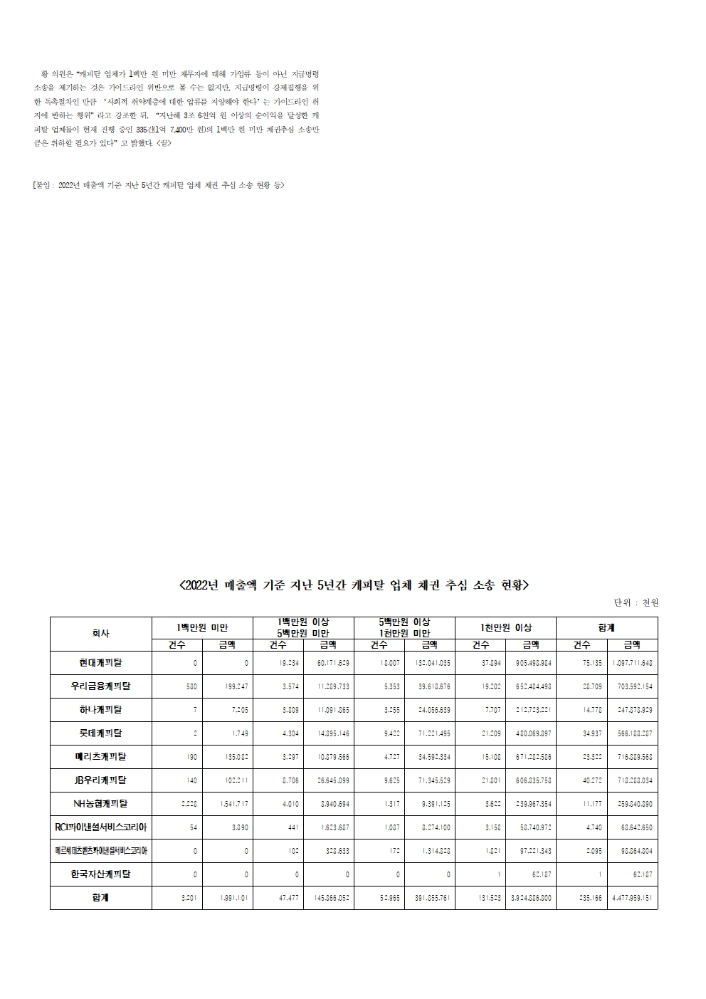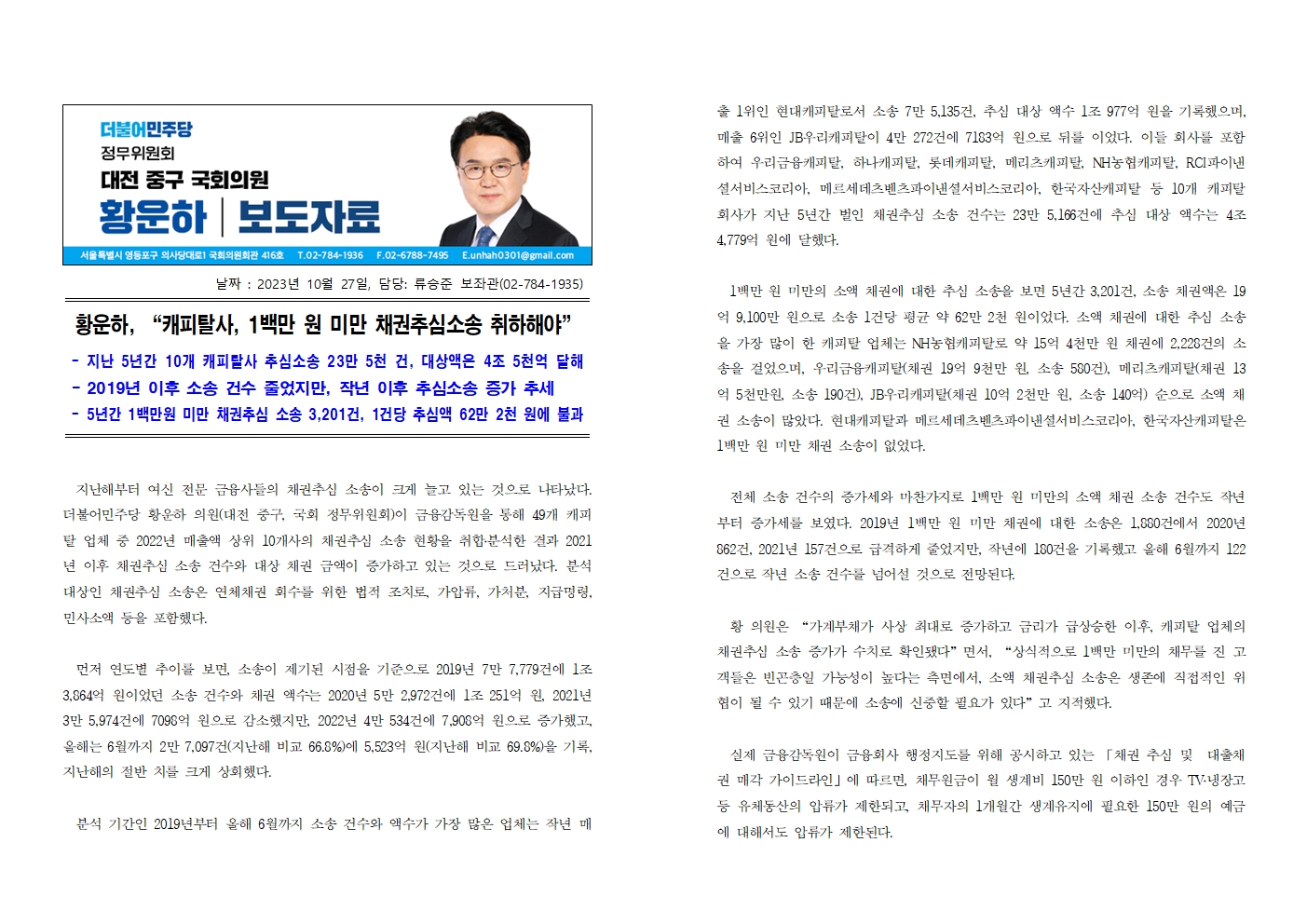 [황운하의원 보도자료] 캐피탈사 , 1 백만 원 미만 채권추심소송 취하해야