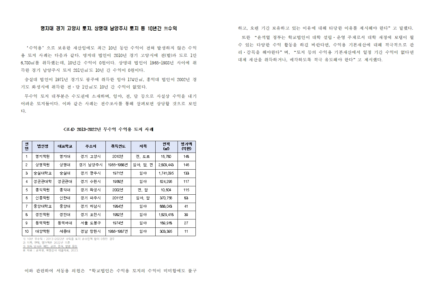231026_국감_서동용_수도권_주요_사립대학_법인_수익_저조한_‘수익용_토지’보유.hwp