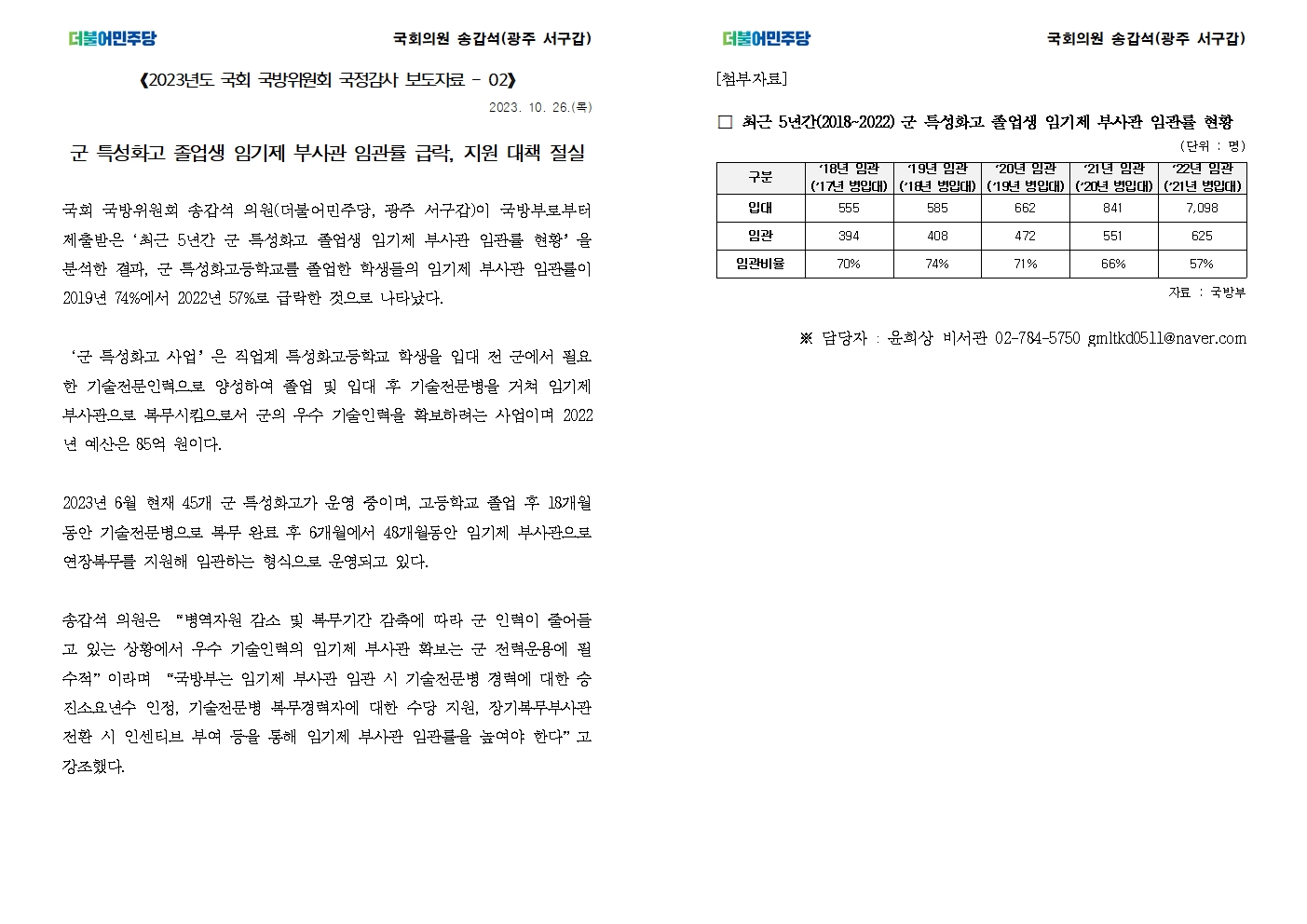 [국회의원 송갑석 국정감사 보도자료] 군 특성화고 졸업생 임기제 부사관 임관률 급락, 지원 대책 절실