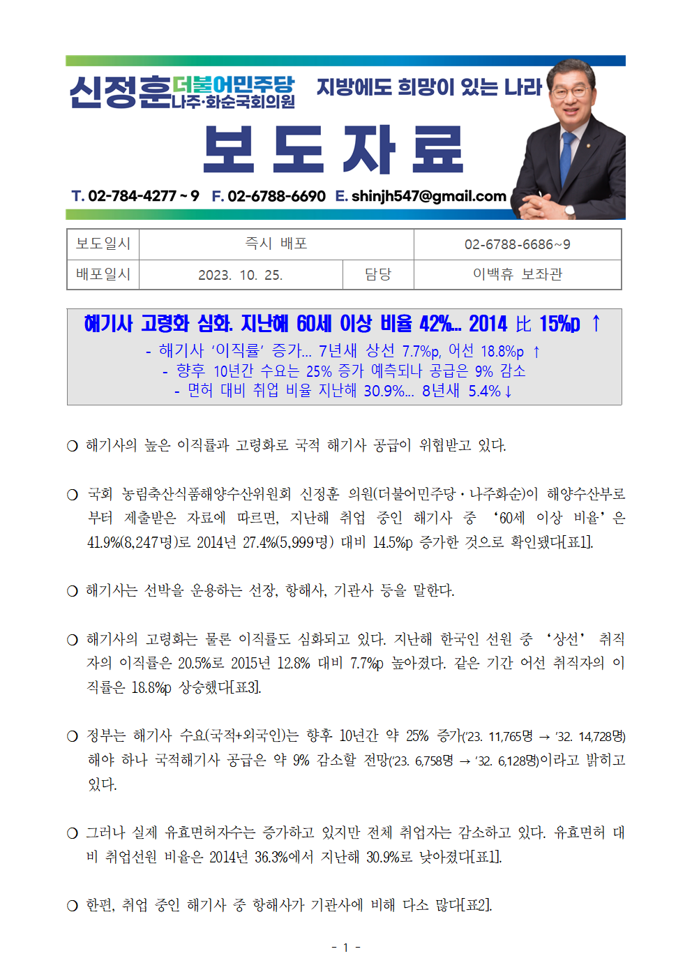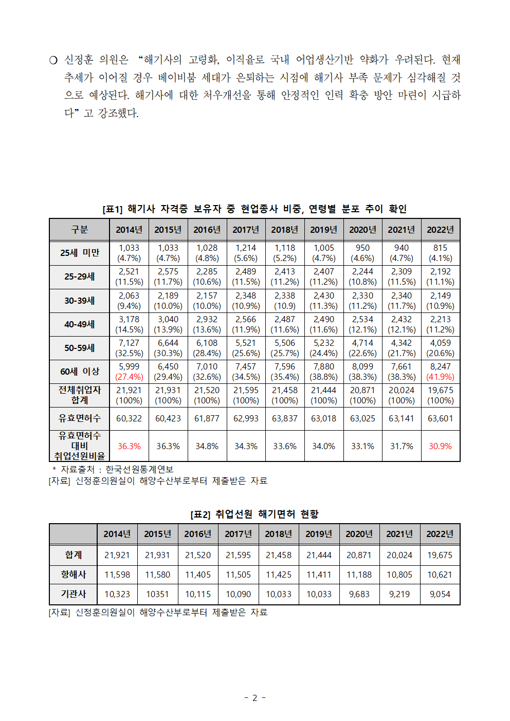 [신정훈 의원실 보도자료]해기사 고령화 심화. 지난해 60세 이상 비율 42%... 2014 比 15%p ↑
