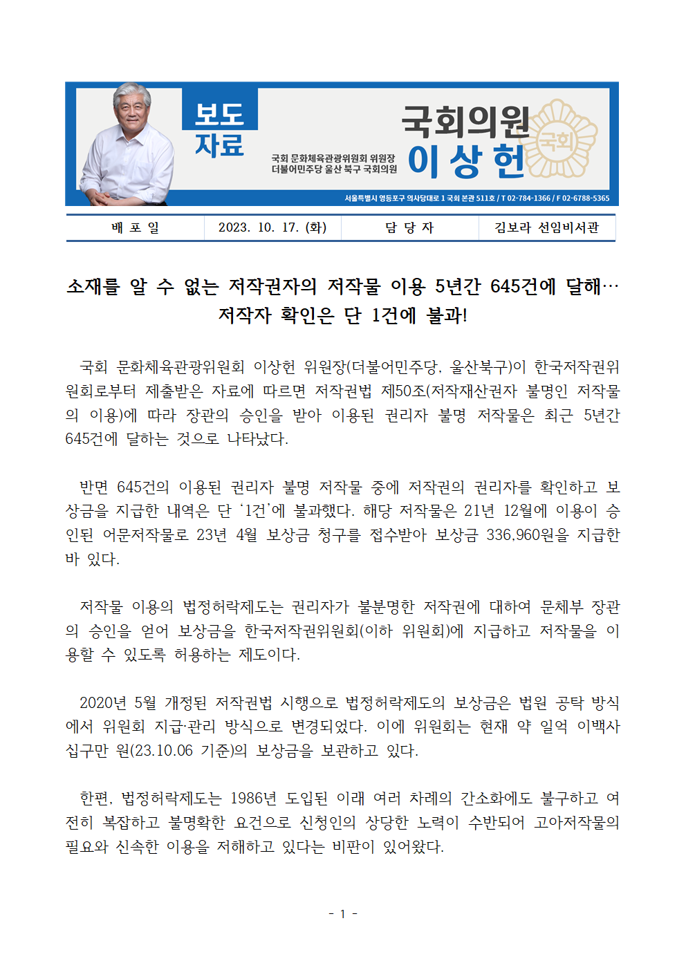 [국회의원 이상헌 보도자료] 소재를 알 수 없는 저작권자의 저작물 이용 5년간 645건에 달해… 저작자 확인은 단 1건에 불과!