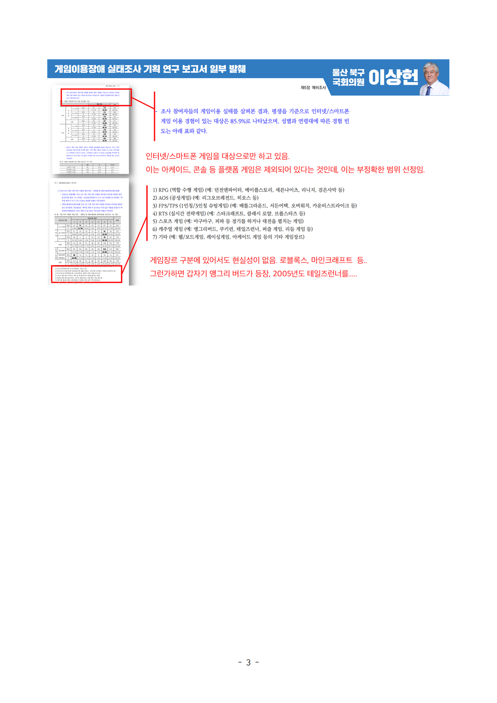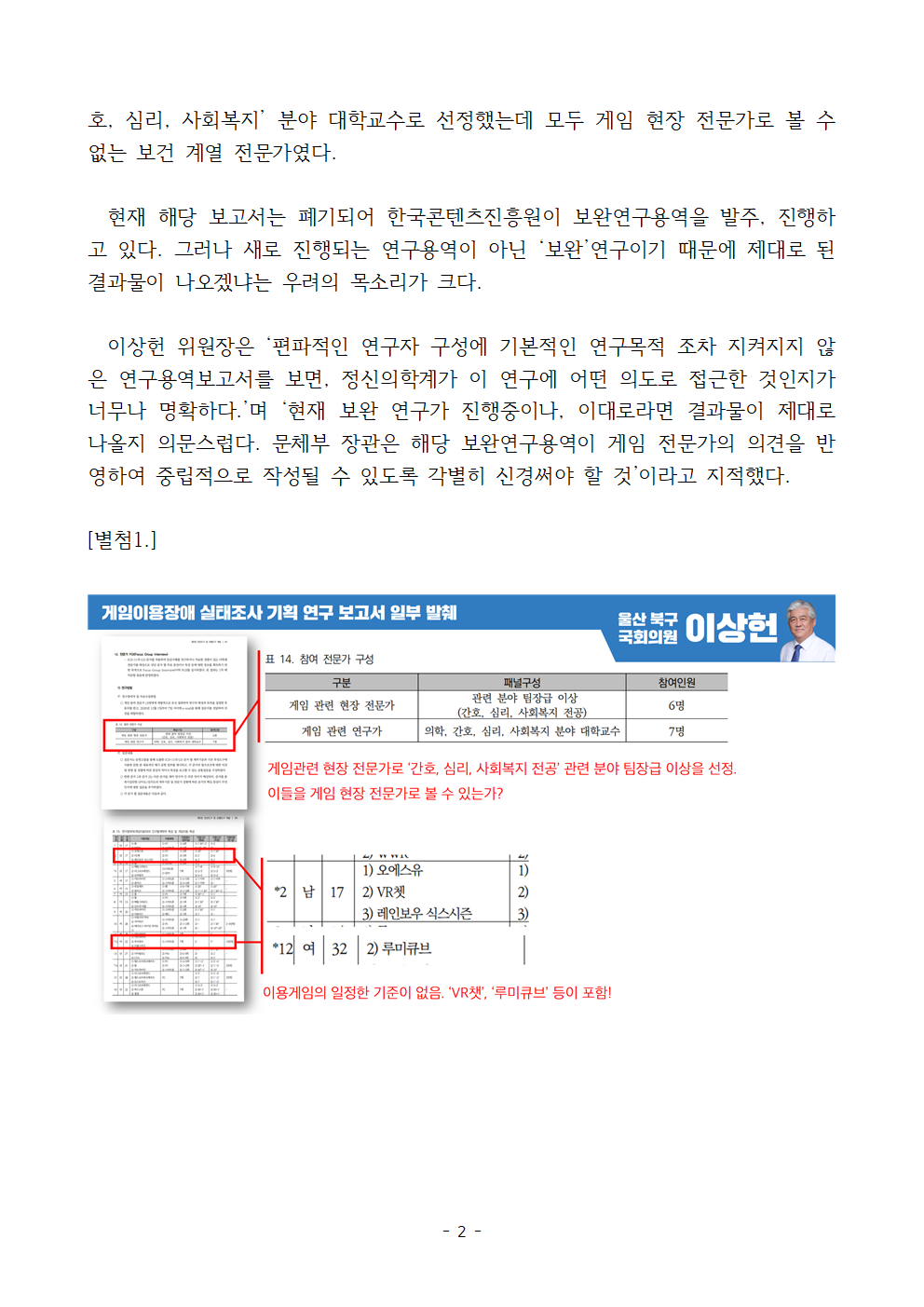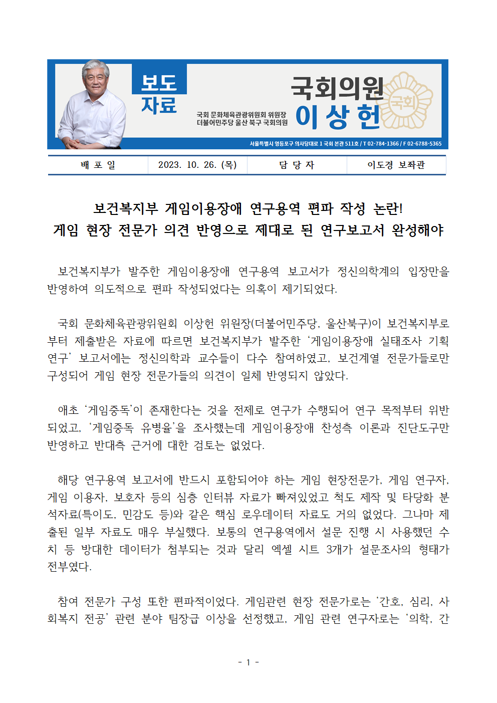 [국회의원 이상헌 보도자료] 보건복지부 게임이용장애 연구용역 편파 작성 논란! 게임 현장 전문가 의견 반영으로 제대로 된 연구보고서 완성해야