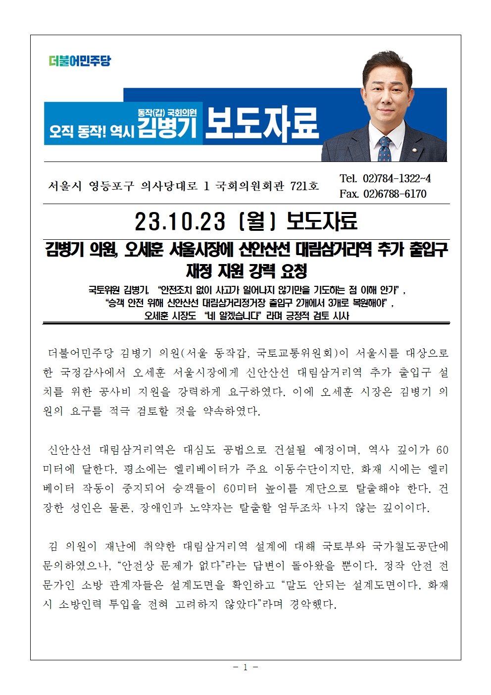 231023_김병기의원_보도자료_김병기_의원 오세훈_서울시장에_신안산선_대림삼거리역_추가_출입구_재정_지원_강력_요청_ver2.hwp