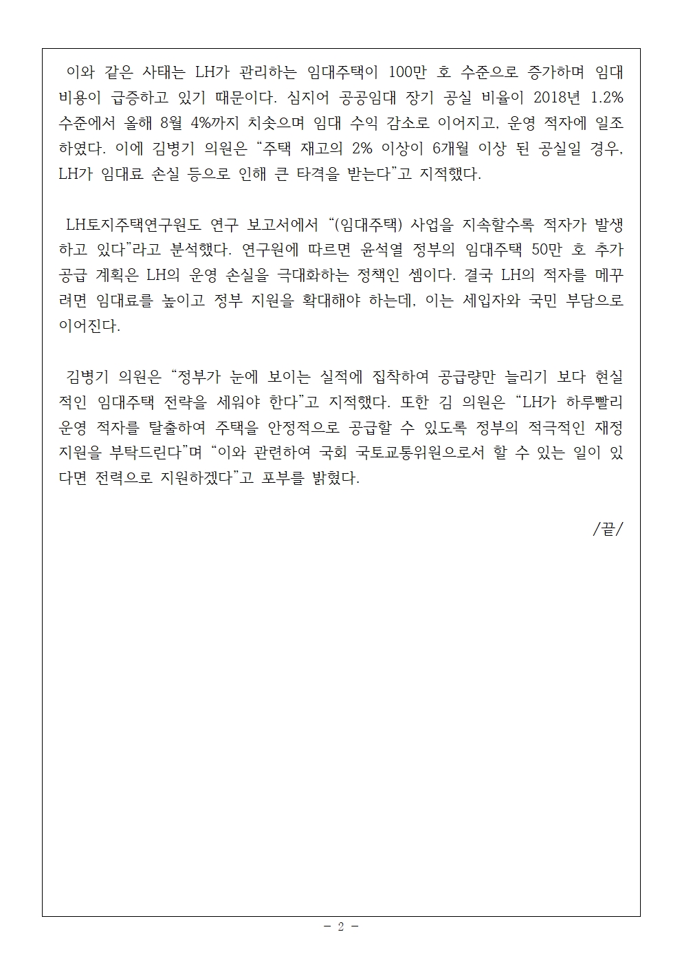 [국회의원 김병기 보도자료] LH 임대주택 적자 2조 '역대 최대'... 정부는 실적용 공급계획만