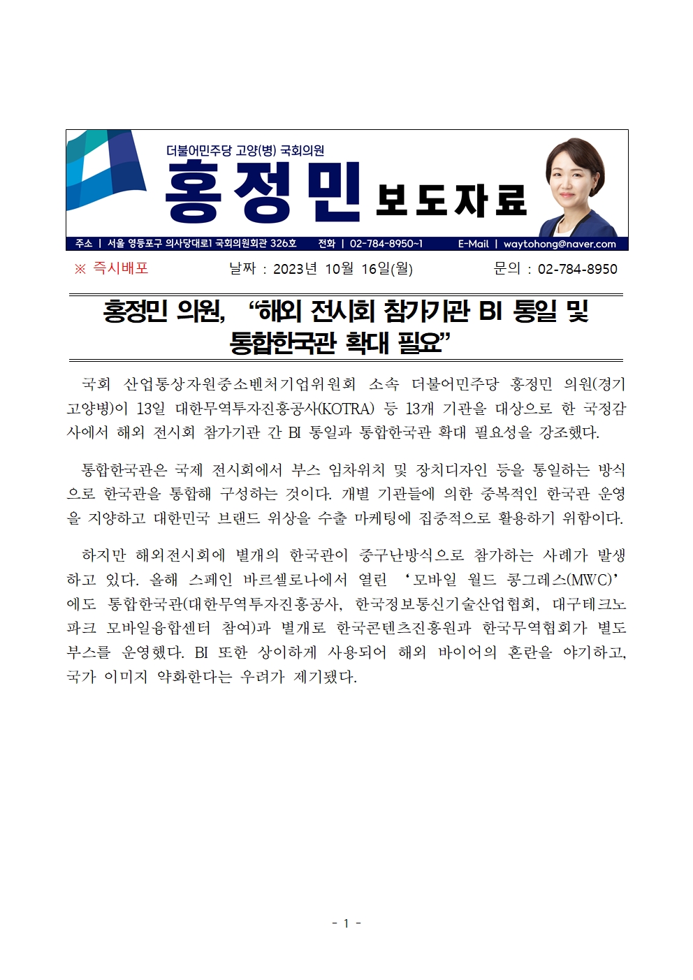 231016_보도자료_홍정민 의원 “해외 전시회 참가기관 BI 통일 및 통합한국관 확대 필요” v5.hwp