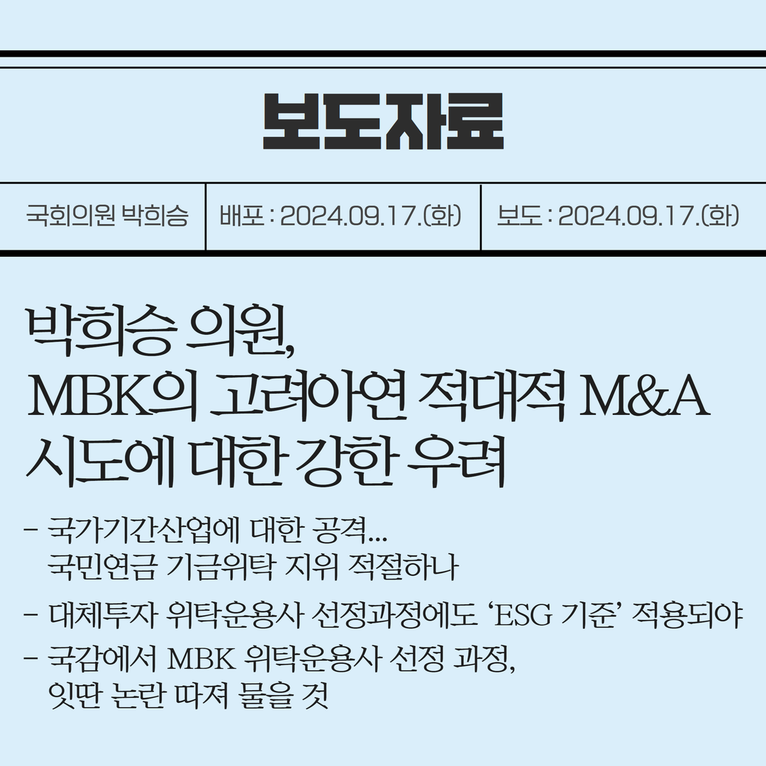 [국회의원 박희승 보도자료] 박희승 의원, MBK의 고려아연 적대적 M&A 시도에 대한 강한 우려