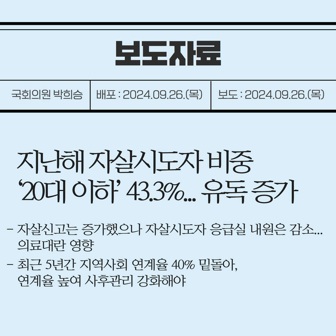 [국회의원 박희승 보도자료] 지난해 자살시도자 비중 ‘20대 이하’ 43.3%... 유독 증가