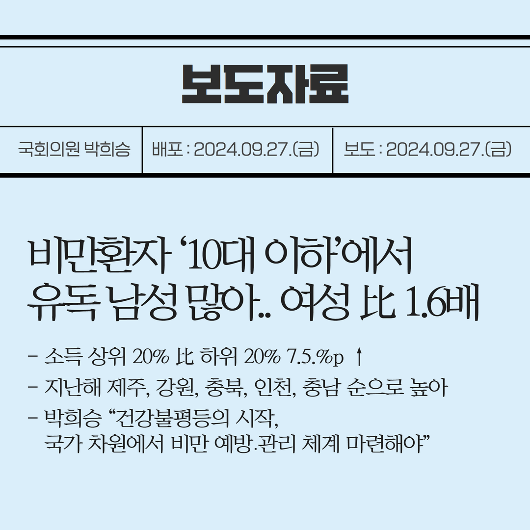 [국회의원 박희승 보도자료] 비만환자 ‘10대 이하’에서 유독 남성 많아.. 여성 比 1.6배