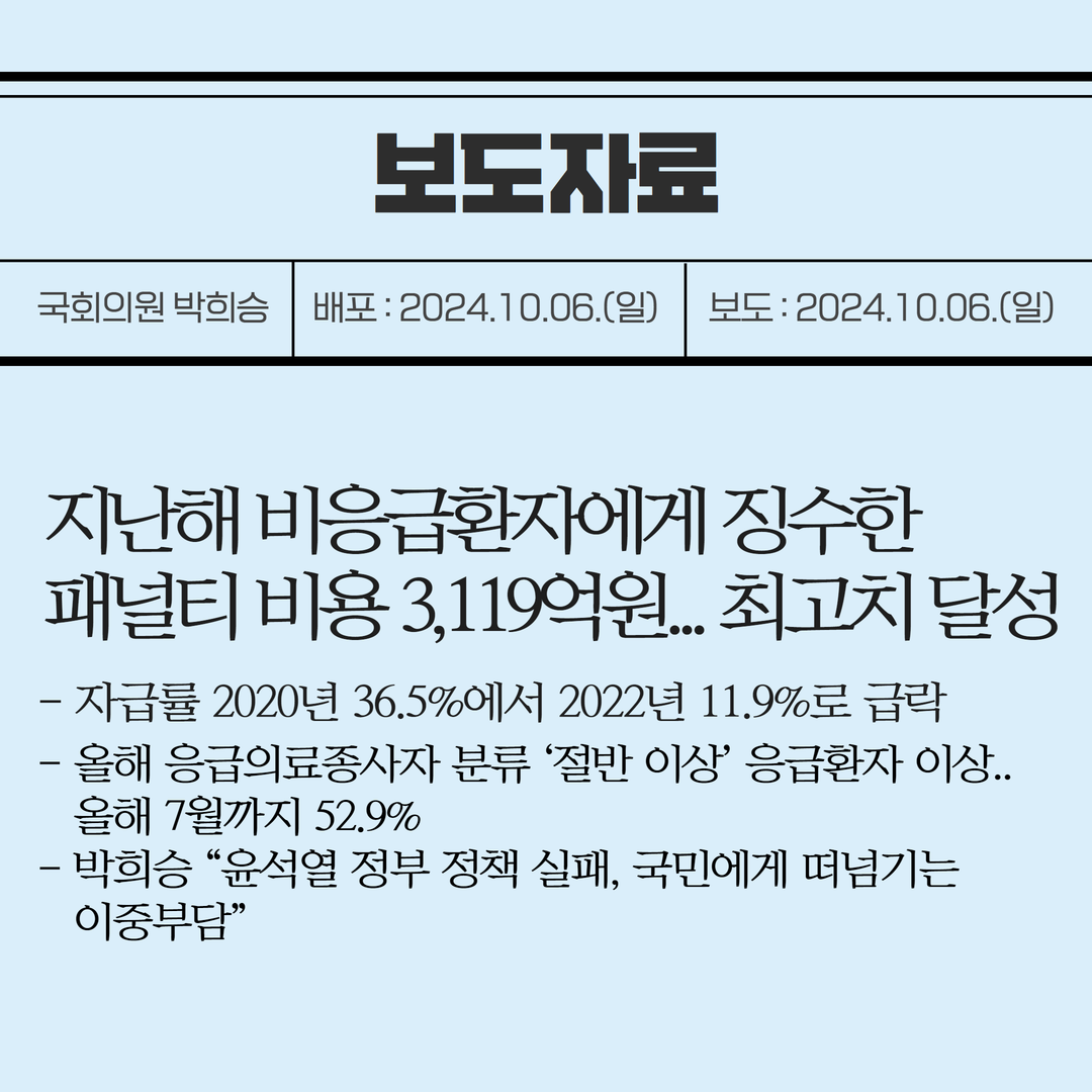 [국회의원 박희승 보도자료] 지난해 비응급환자에게 징수한 패널티 비용 3,119억원... 최고치 달성