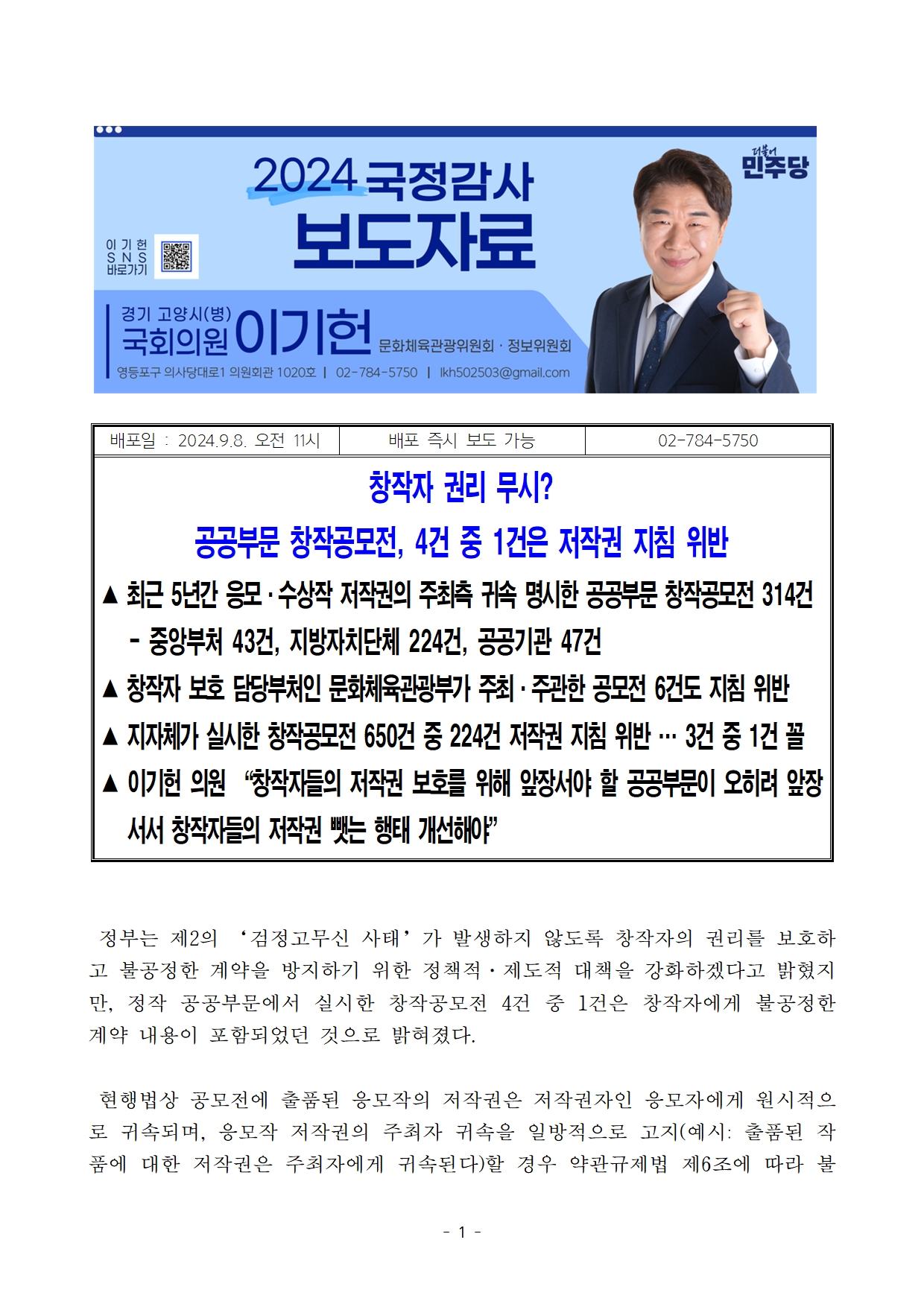 [이기헌 의원(고양시 병) 보도자료] 창작자 권리 무시? 공공부문 창작공모전, 4건 중 1건은 저작권 지침 위반