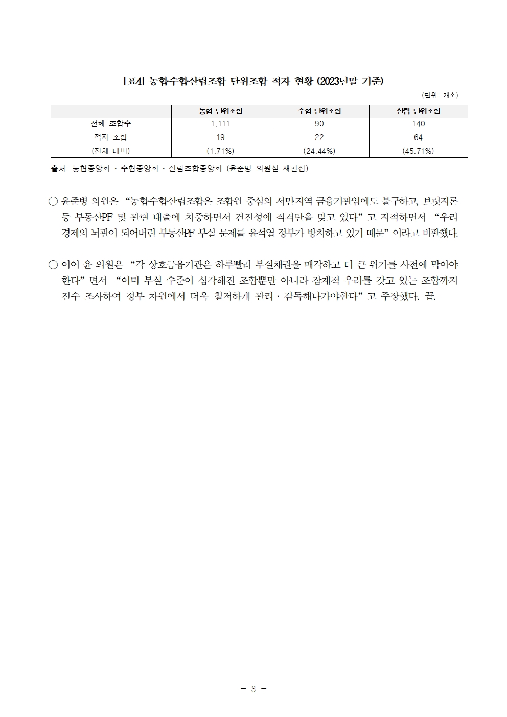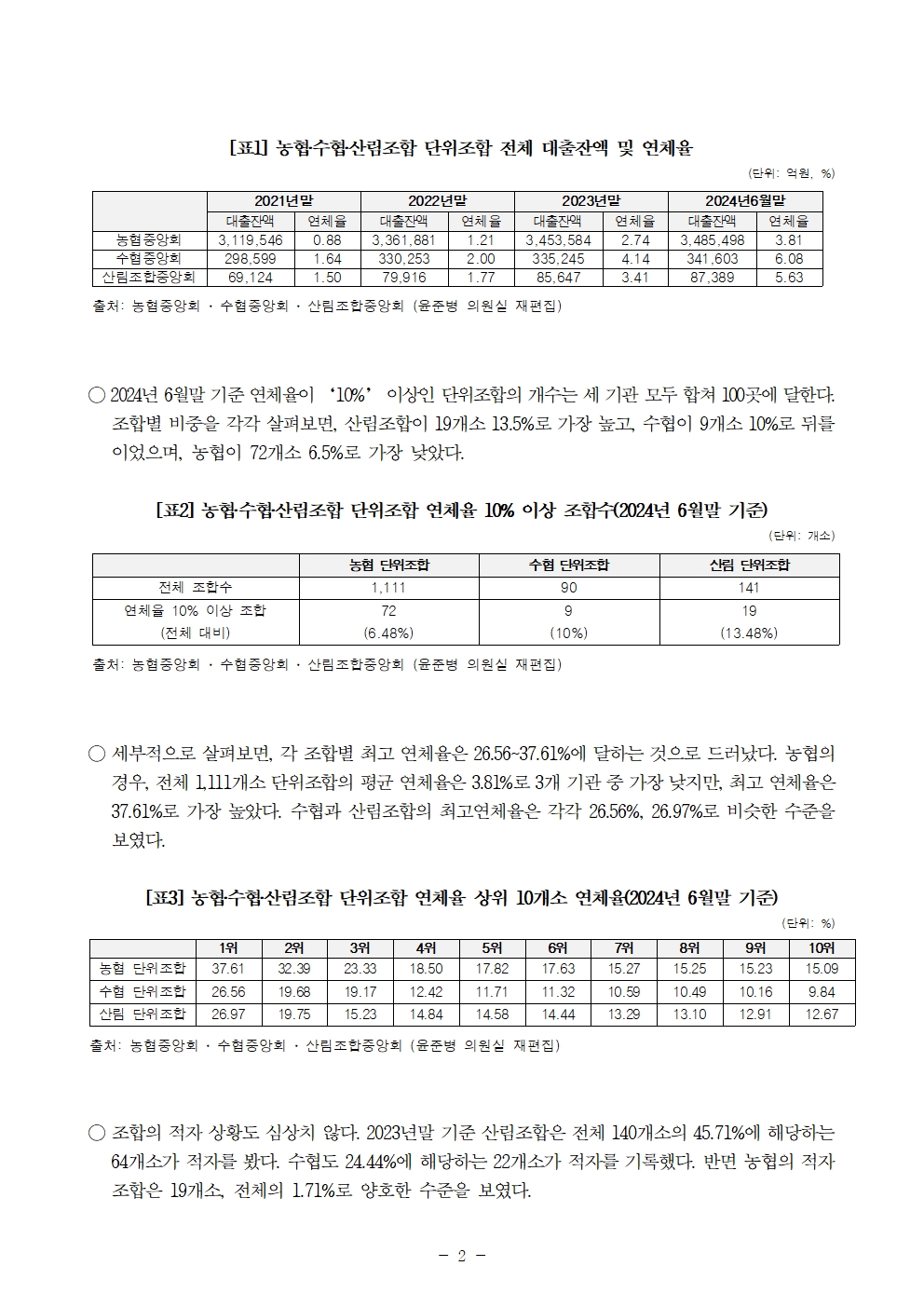 240918 [윤준병 의원 국정감사 보도자료] 37.61%까지 치솟은 농림‧수산 단위조합 연체율 “부실 심각” (1).hwp