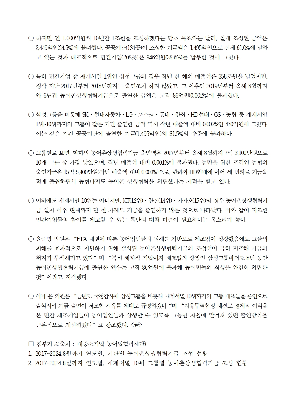 [윤준병 의원 국정감사 보도자료] 재계서열 상위 10위 그룹이 8년간 출연한 농어촌상생기금_ 작년 매출액의 고작 0.003% 불과!