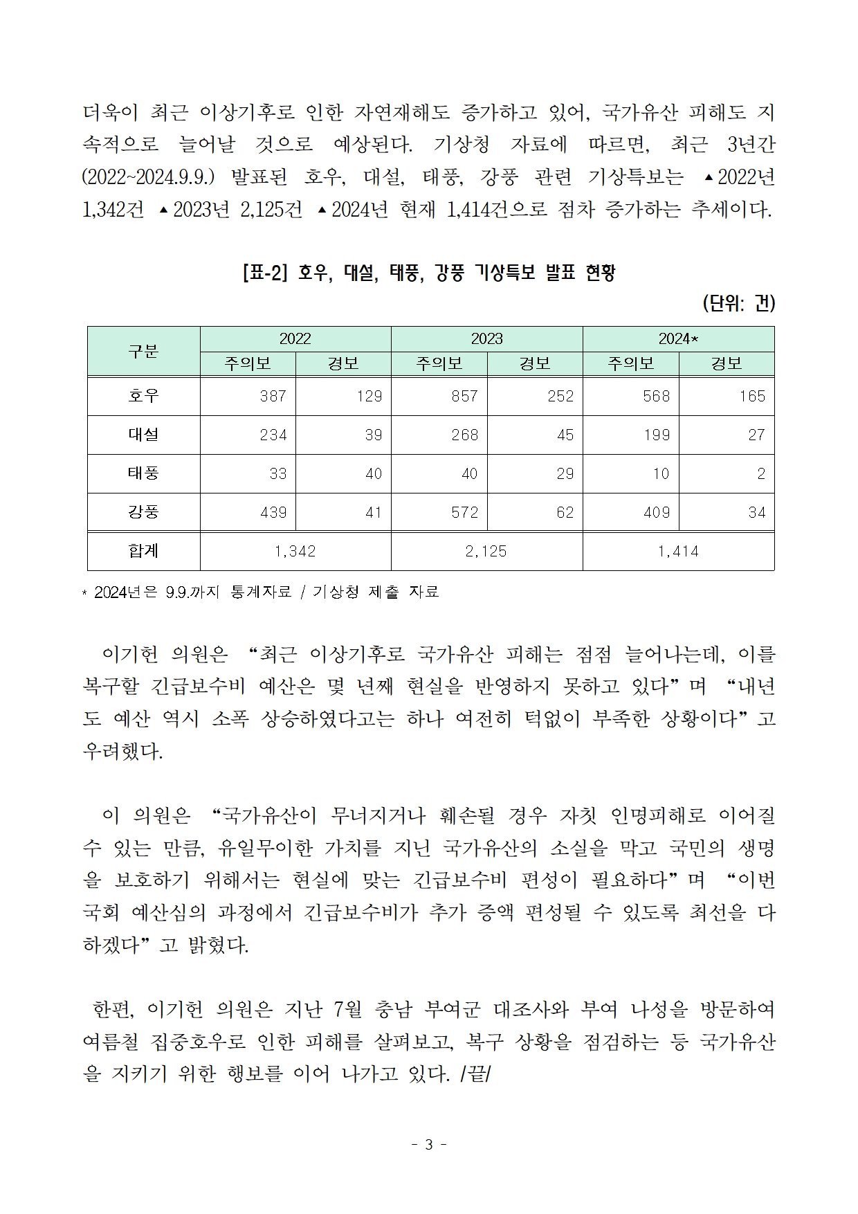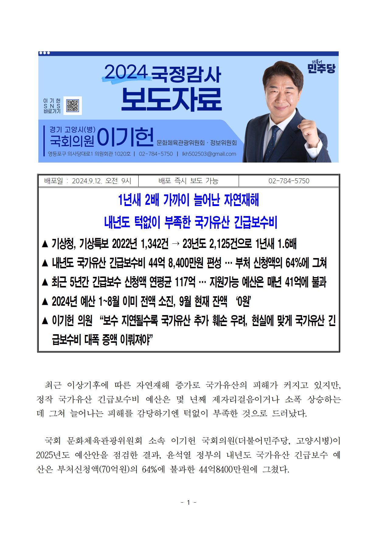 (최종)_이기헌의원실_국감보도자료_자연재해 대비 턱없이 부족한 국가유산 긴급보수비.hwp