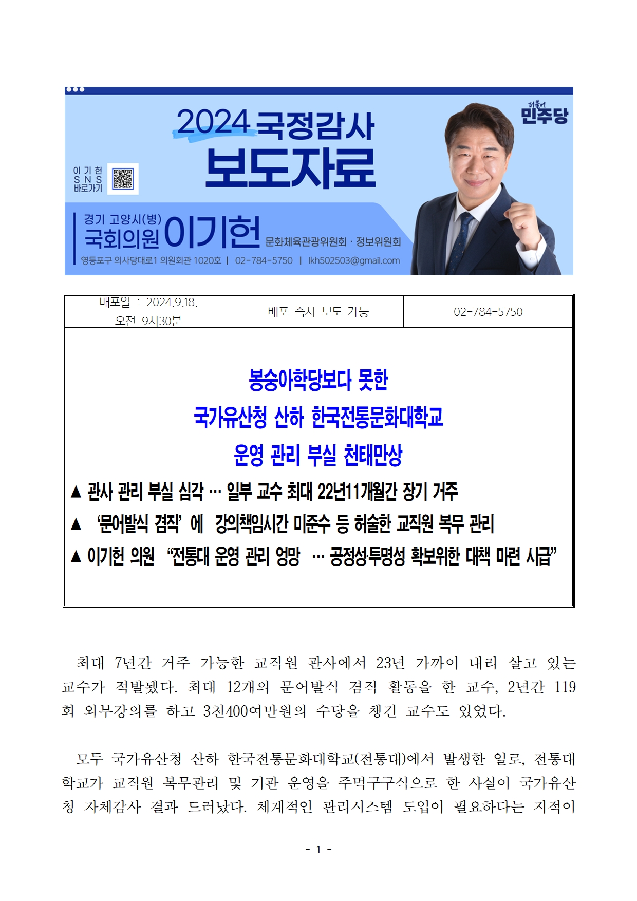 (최종)_이기헌의원실_국감보도자료_한국전통문화대 운영 관리 부실 천태만상.hwp