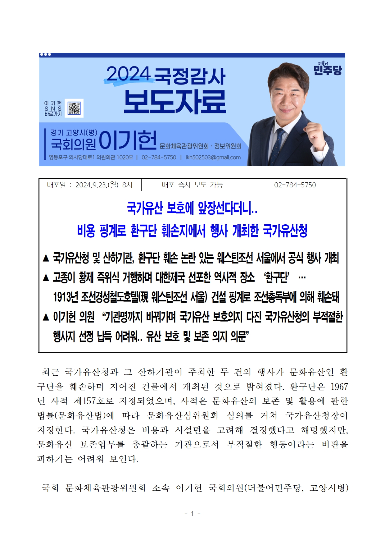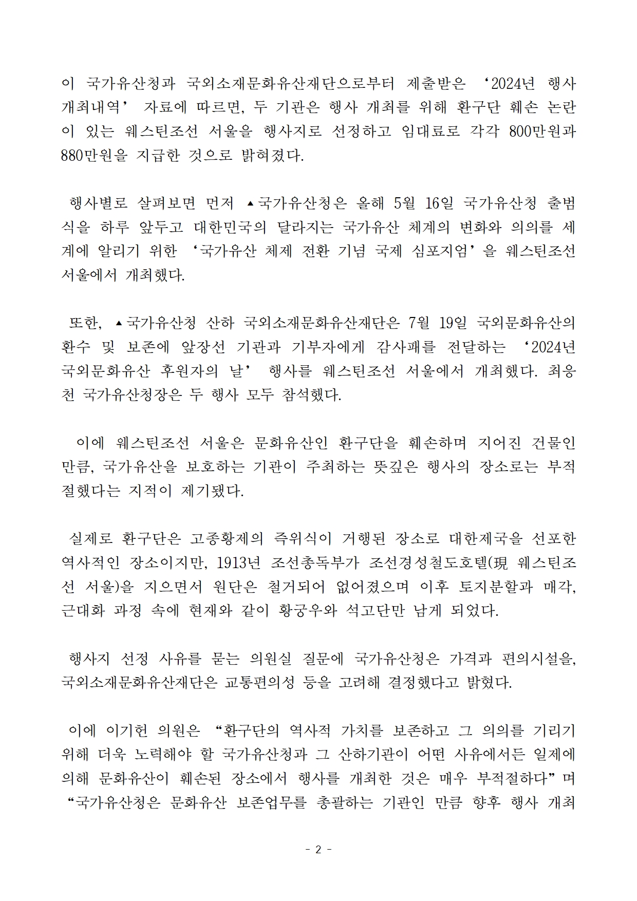 [이기헌 의원(고양시 병) 보도자료] 국가유산 보호에 앞장선다더니 환구단 훼손지에서 행사 개최