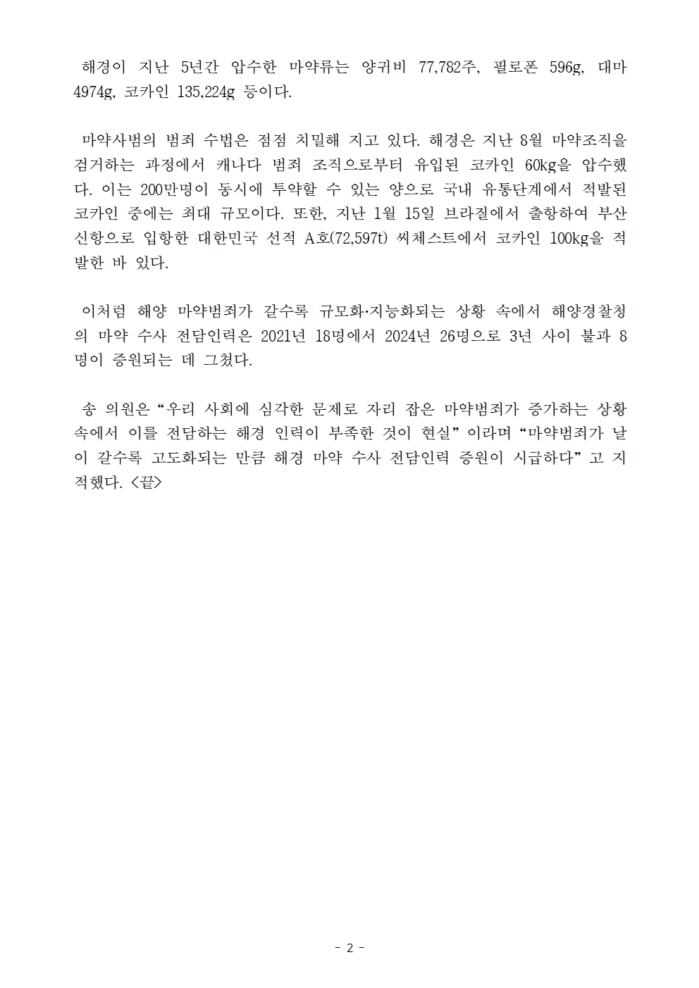 보도자료_송옥주의원실_해양경찰청 마약범죄 검거 3473건 대한민국 해양 마약 사각지대 전락.hwp