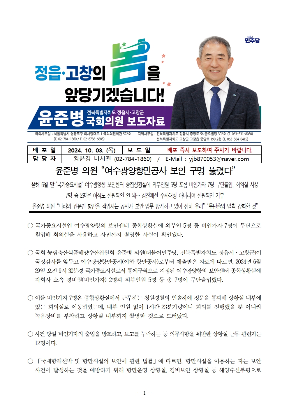 241003 [윤준병 의원 국정감사 보도자료] 윤준병 의원_ 여수광양항만공사 보안 구멍 뚫렸다.hwp