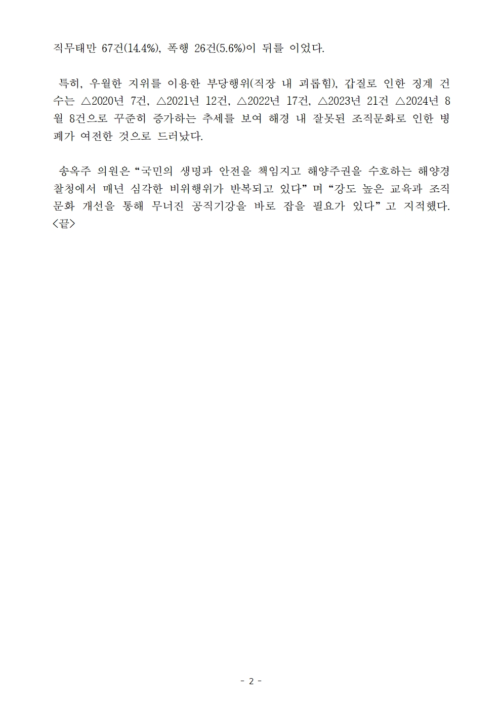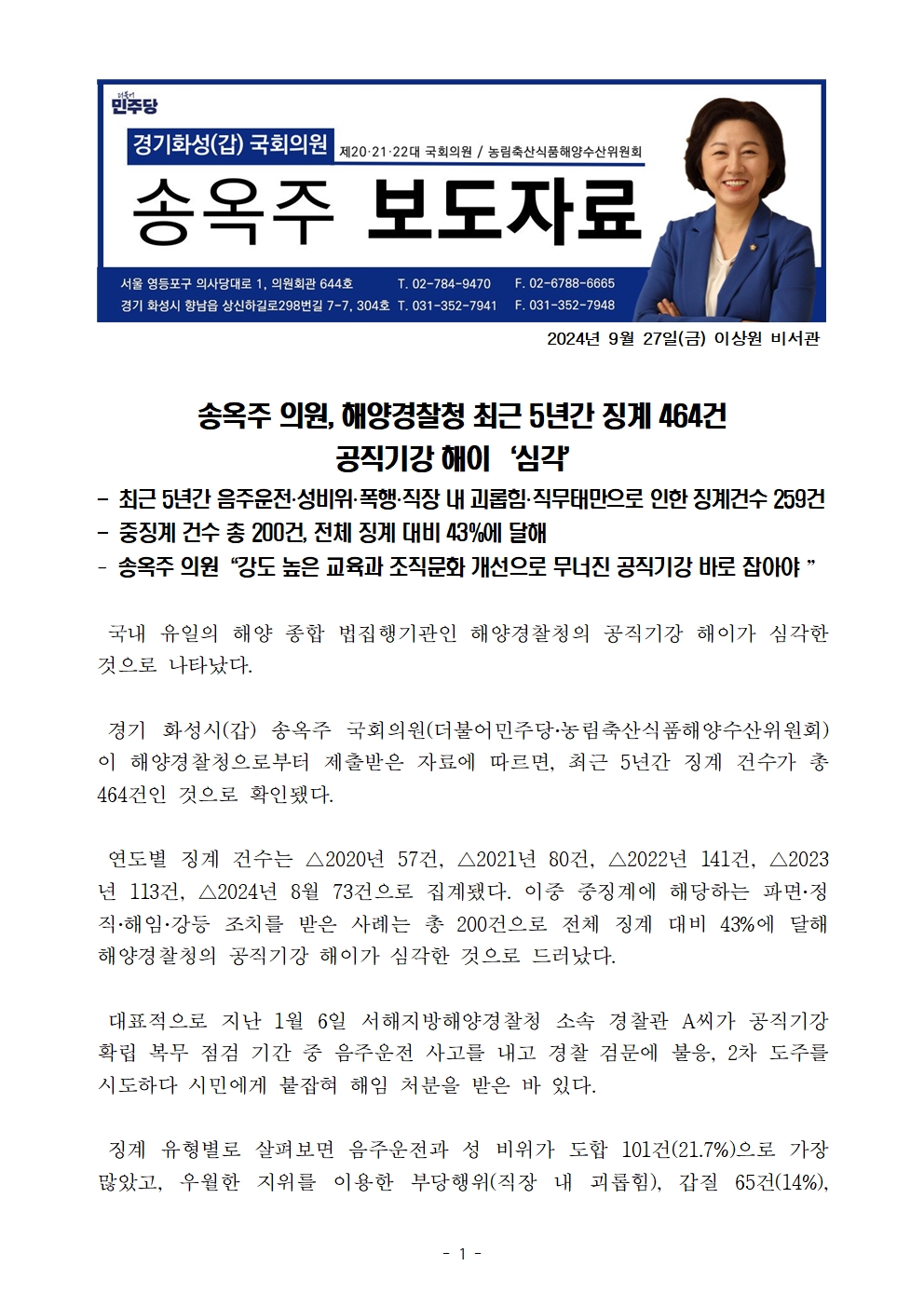 보도자료_송옥주의원실_송옥주 의원 해양경찰청 최근 5년간 징계 464건 공직기강 해이 심각 .hwp