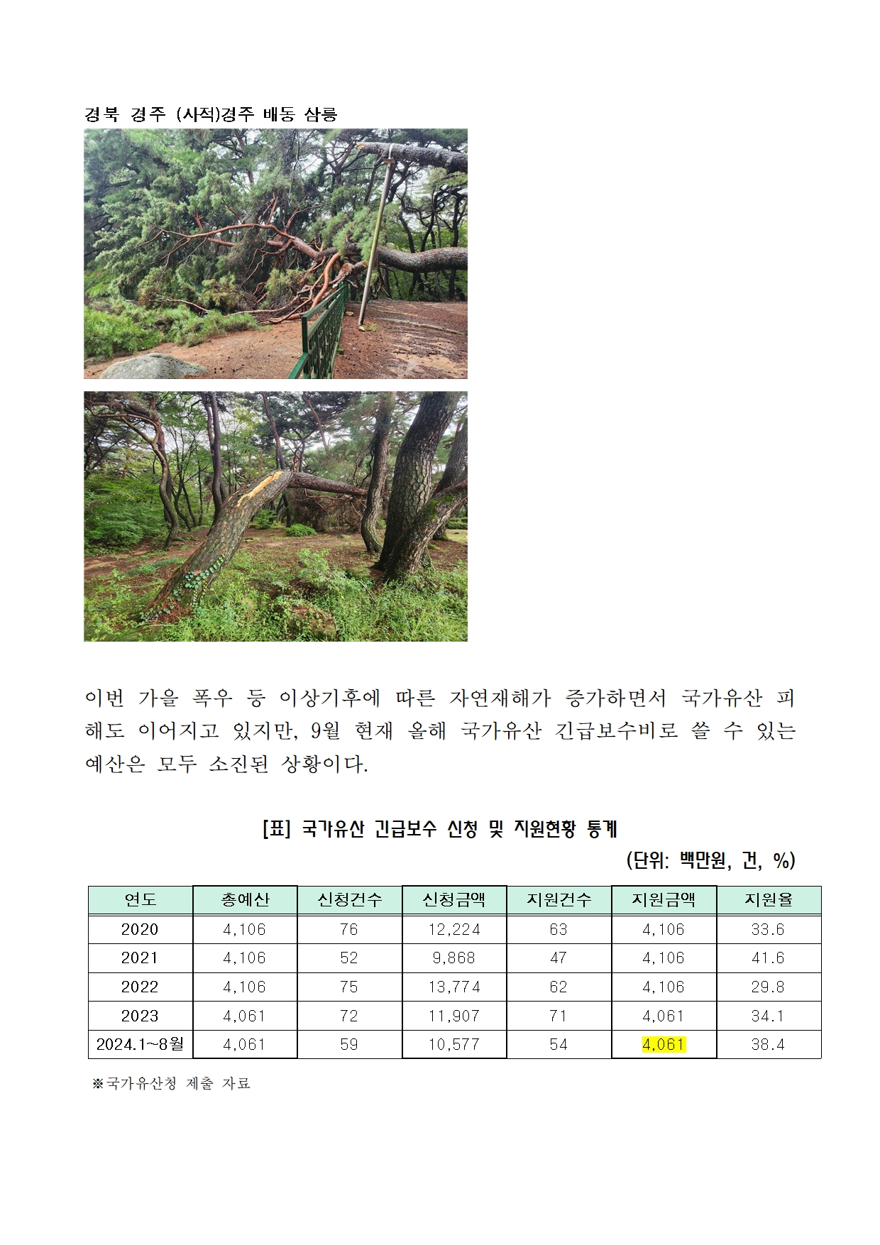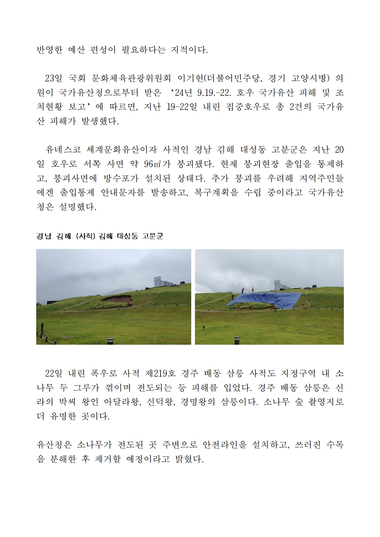 [이기헌 의원(고양시 병) 보도자료] 국가유산 긴급보수비 0원인데..기록적 가을 폭우로 국가유산 2건 피해