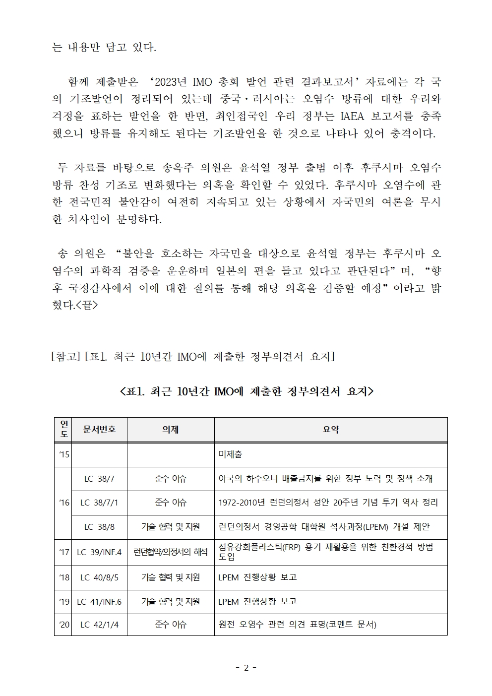 보도자료_송옥주 의원 윤석열 정부 출범 이후 후쿠시마 오염수‘방류 찬성 기조로 변화’ 국감서 의혹 제기.hwp