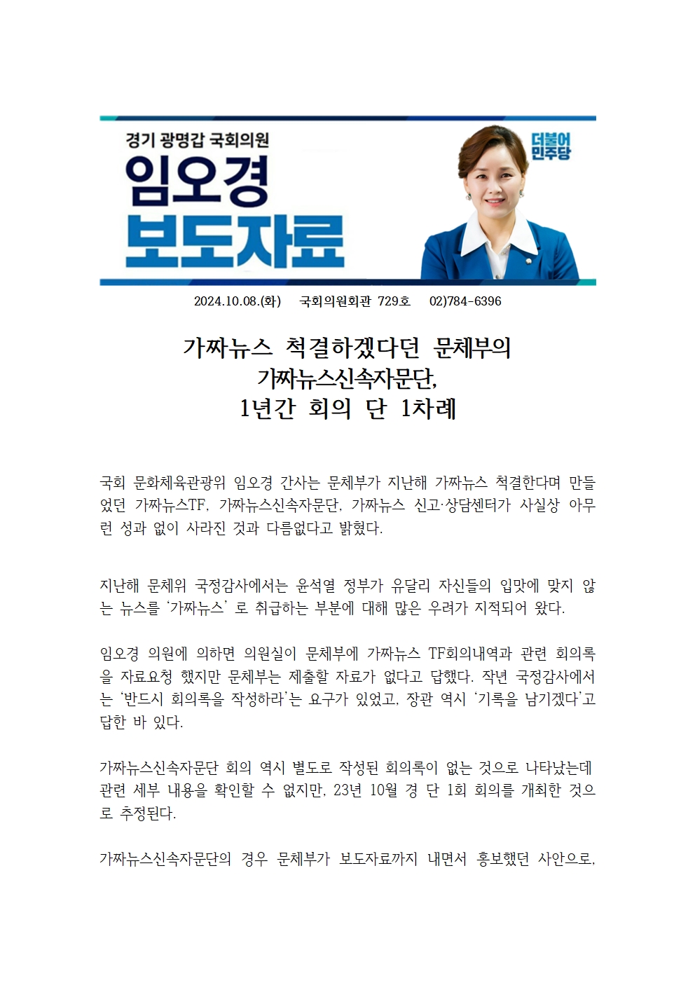 24.10.08_임오경 국회의원 보도 _가짜뉴스 척결하겠다던 문체부의 가짜뉴스신속자문단 1년간 회의 단 1차례.hwp