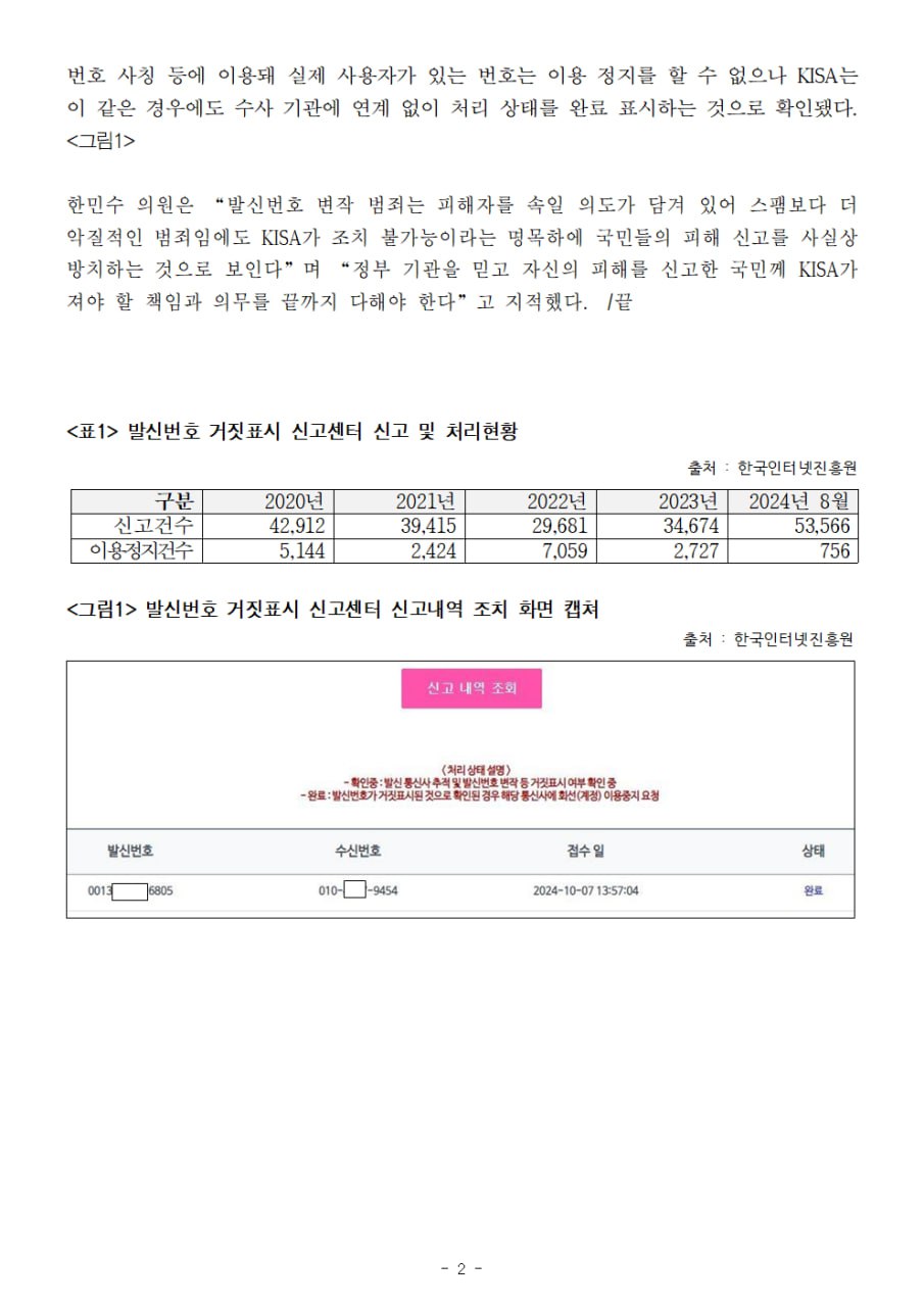 [국회의원 한민수] 허위조작번호 피해사례 정부기관 신고에도 국민 98.6% 처리결과 통보조차 못받아