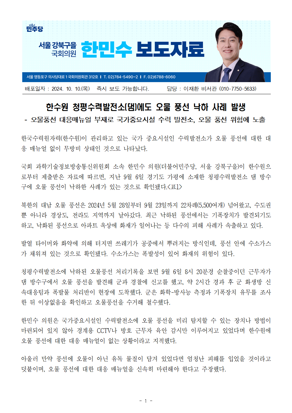 [국회의원 한민수] 한수원 청평수력발전소(댐)에도 오물 풍선 낙하 사례 발생