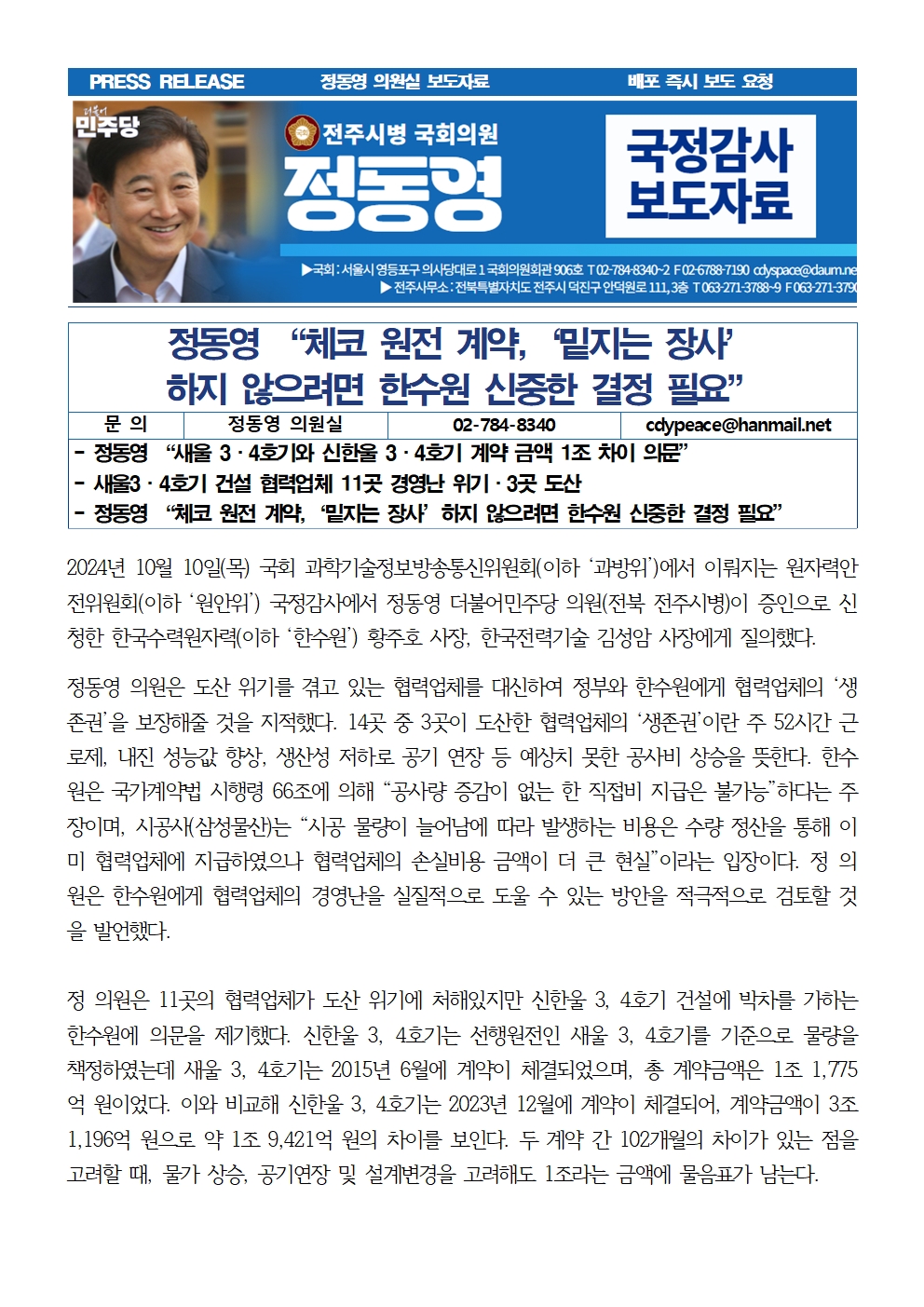 [국회의원 정동영 국감보도자료] 정동영 “체코 원전 계약,‘밑지는 장사’ 하지 않으려면 한수원 신중한 결정 필요”