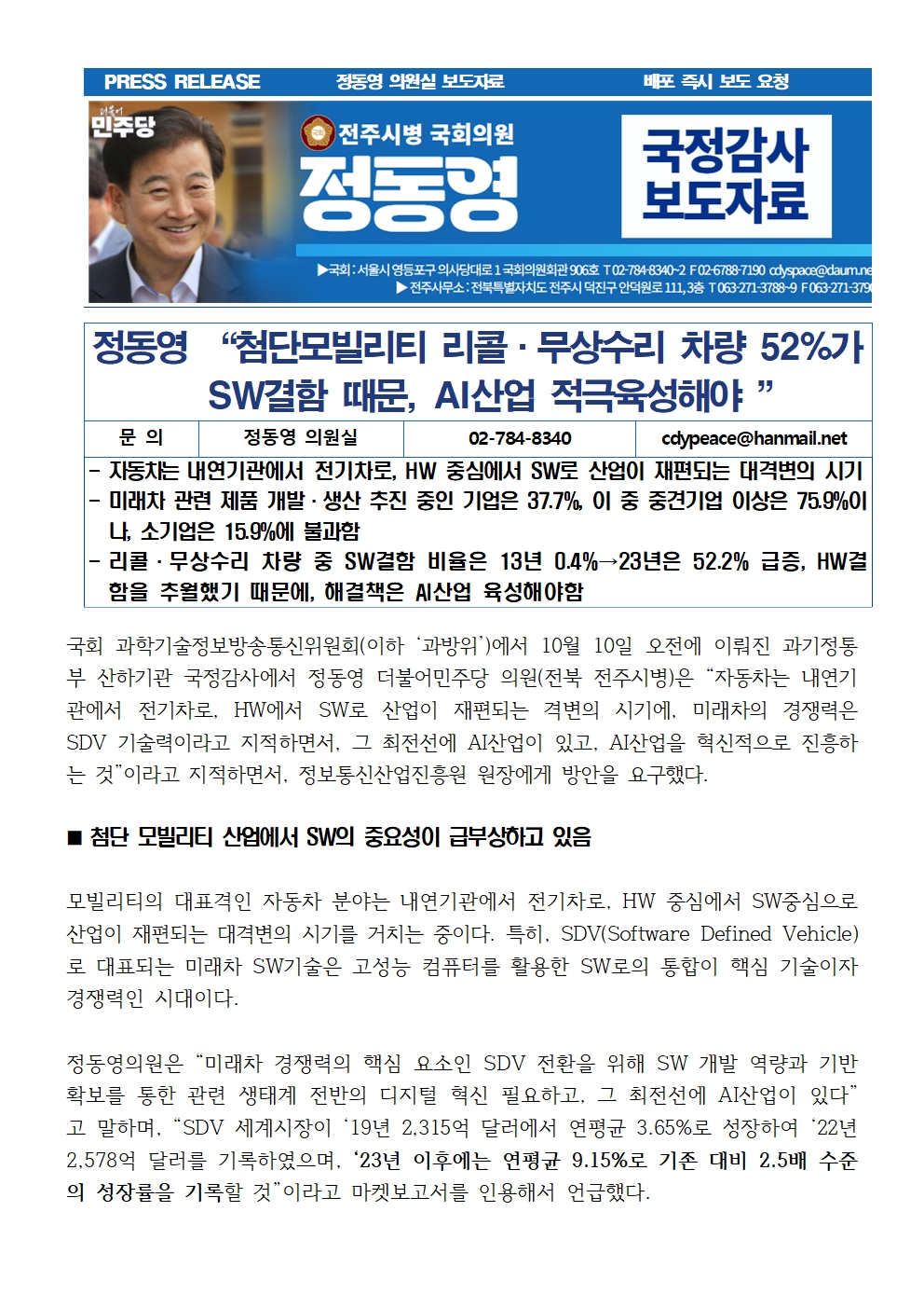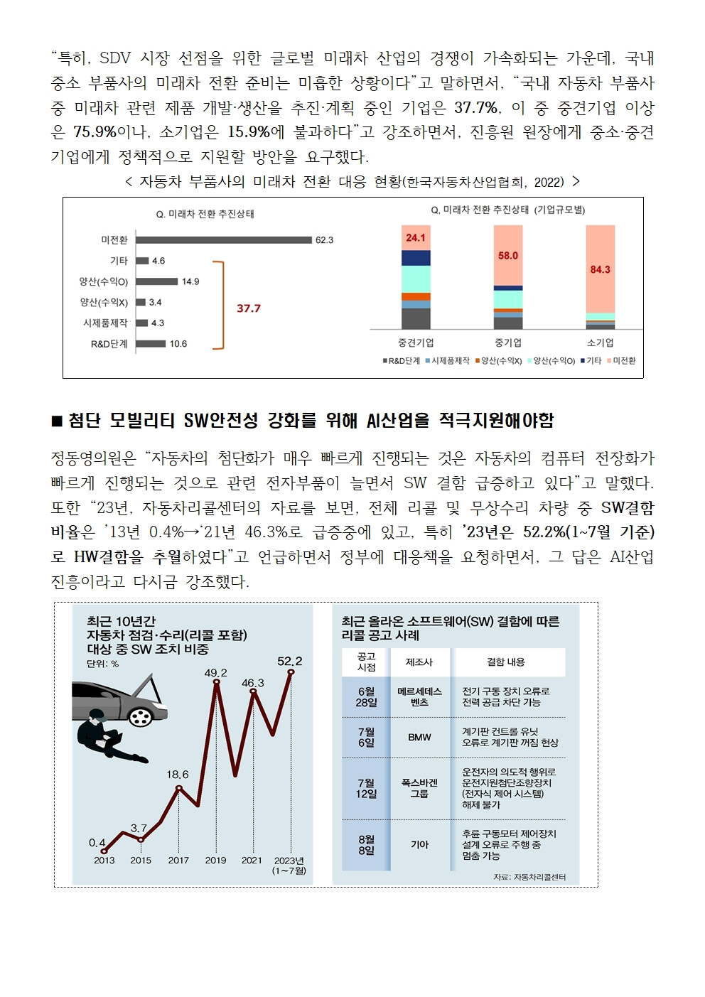 [국회의원 정동영 국감보도자료] 정동영 “첨단모빌리티 리콜·무상수리 차량 52%가 SW결함 때문, AI산업 적극육성해야 ”