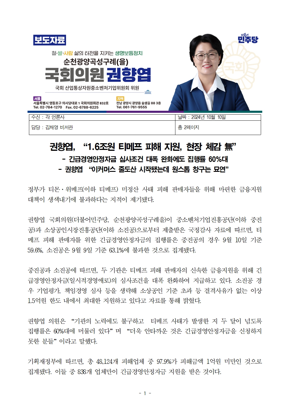 [권향엽 국회의원]_241010_권향엽 “1.6조원 티메프 피해 지원 현장 체감 無” .hwp