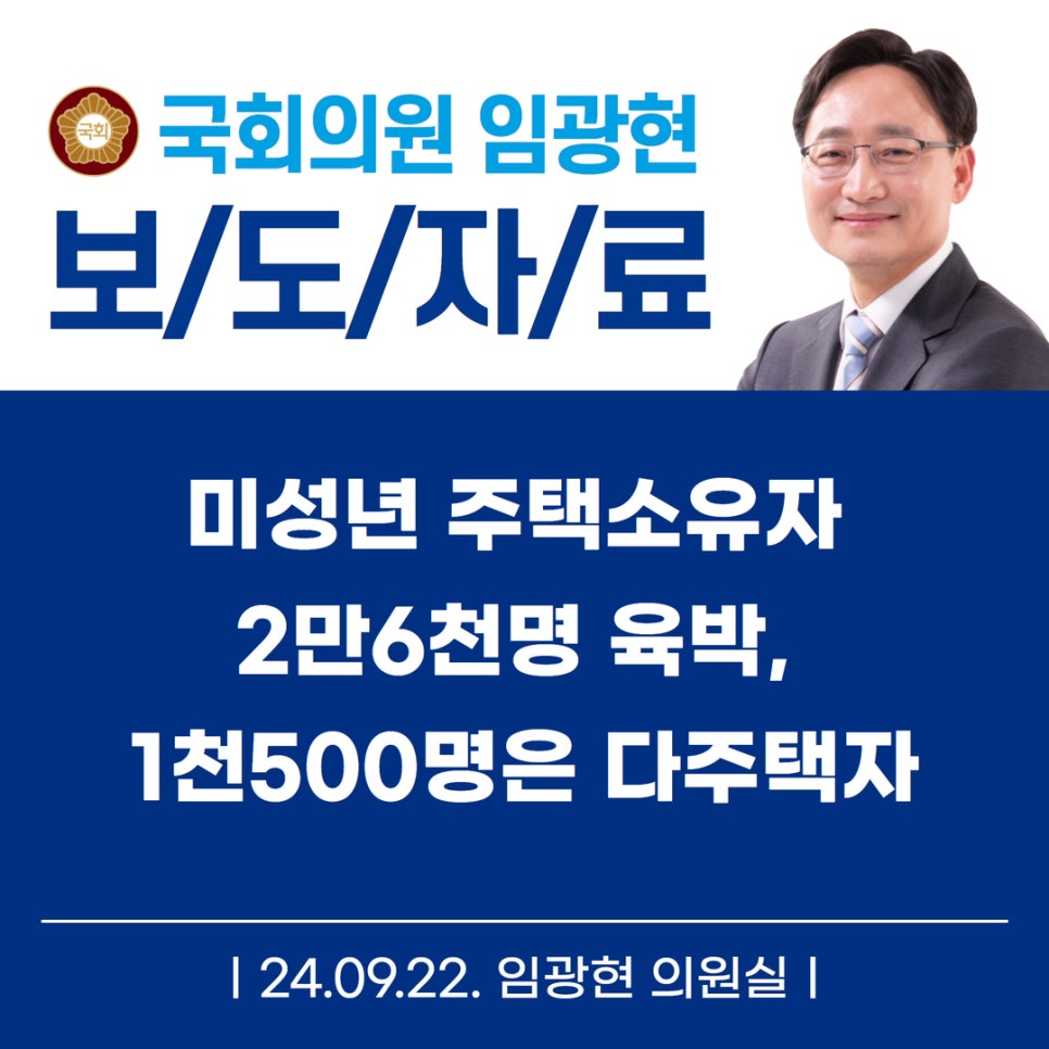 임광현 의원은 미성년 주택소유 증가로 태생적인 자산 격차 확대 문제를 비롯한 주택보유의 양극화 심화 추세가 확인된다주택 투기수요를 억제하고 시장에 주택 매물을 원활히 유도하여 국민의 주거안정을 제고하기 위한 종합적인 대책이 필요하다고 밝혔다. ()
