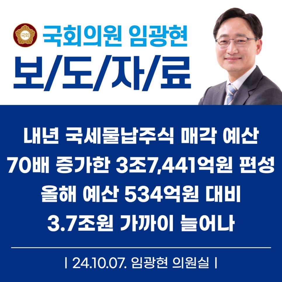 [임광현의원 국감 보도] 내년 국세물납주식 매각 예산 70배 증가한 3조7,441억원 편성올해 예산 534억원 대비 3.7조원 가까이 늘어나