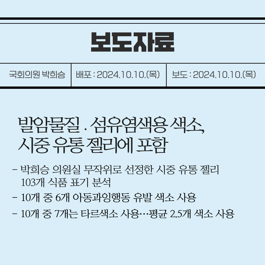 [국회의원 박희승 보도자료] 발암물질 ․ 섬유염색용 색소, 시중 유통 젤리에 포함