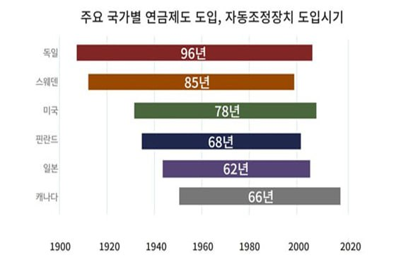 독일은 1908년 국민연금을 도입한 이후에 96년이 지난 2004년에 연금개혁을 통해 자동안정장치를 도입했다. 스웨덴은 1913년에 연금제도를 도입한 이후 85년이 지난 1998년에 자동안정장치를 도입했다. 미국도 1935년에 연금제도를 도입한 이후 78년이 지난 2013년에 자동안정화장치를 도입했다. 이외에도 핀란드는 68년 이후, 캐나다는 66년 이후, 일본은 62년 이후에 자동조정장치를 도입했다.