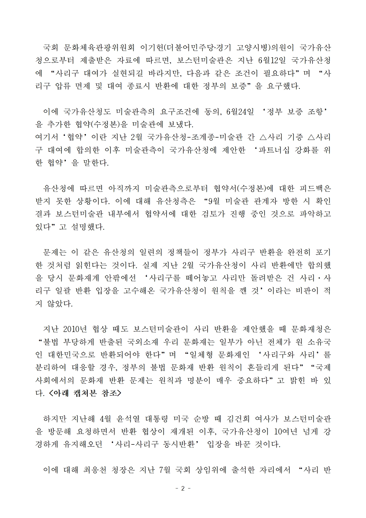 (최종)이기헌의원_국감보도자료_압류 면제 대여 종료시 반환 조건 붙은 보스턴미술관 소장 사리구 대여.hwp