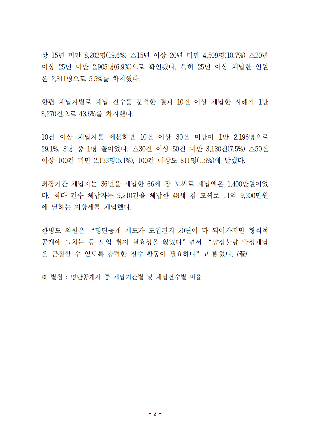 [한병도의원]2024행안위국정감사보도자료(23)_36년 버티거나 9210건 체납하거나... 명단공개에도 버티는 만성 고액체납자.hwp